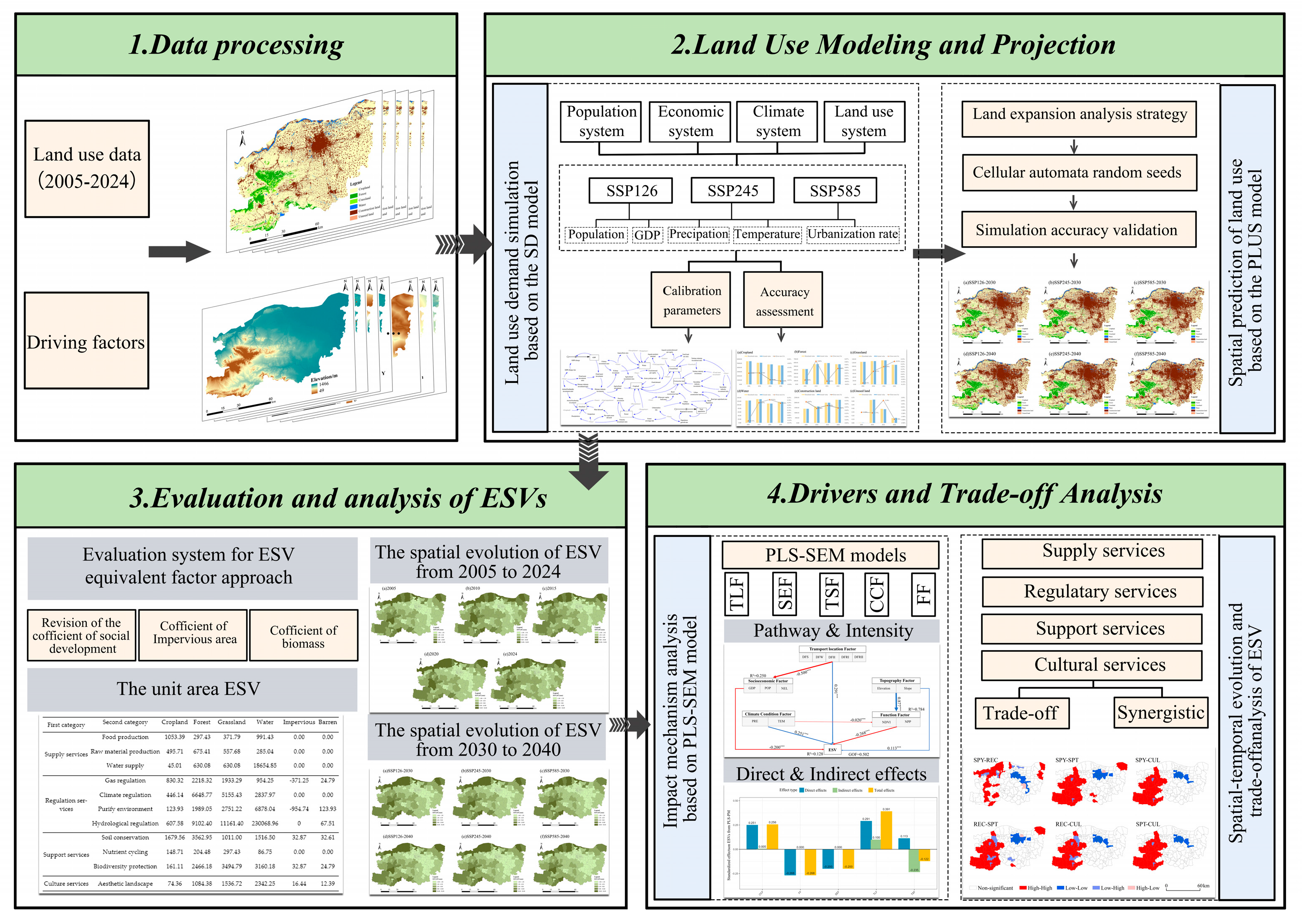 The main work content and process of this study are shown in Figure 2: Firstly, data processing is performed to examine the trends and patterns in the historical development of LUCC between 2005 and 2024. Based on various SSP-RCP scenarios, the SD-PLUS model was incorporated to simulate future land use under climate change scenarios for 2030 and 2040. Second, the equivalent factor method was applied to assess changes in ESV from 2005 to 2024, along with projections for 2030 and 2040 under various scenarios. PLS-SEM analysis was performed to investigate the driving mechanisms of ESV across various factors. Lastly, the trade-offs and synergies and spatial heterogeneity of ecosystem services were investigated using Pearson correlation coefficients and spatial autocorrelation analysis.
