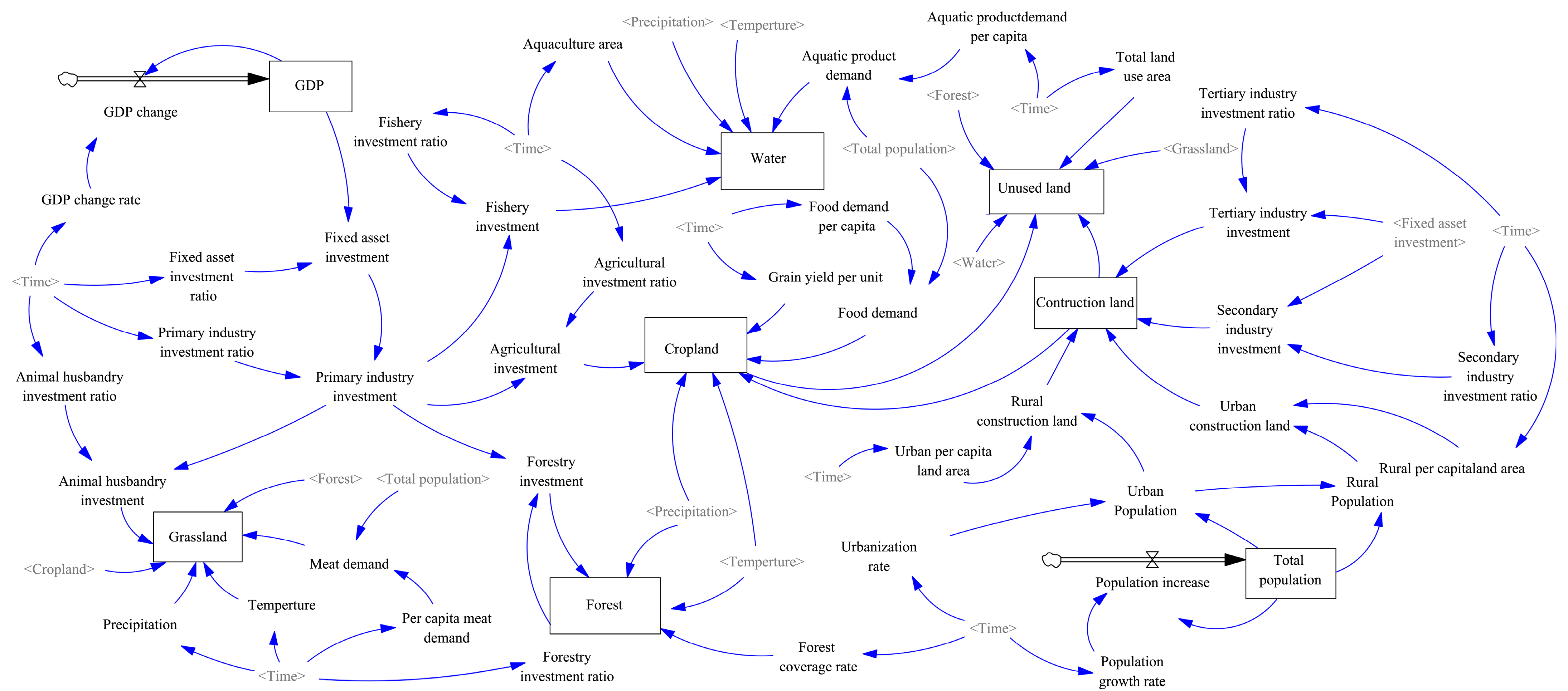 The SD model for land demand, as constructed in this study, incorporates population, economic, climate, and land subsystems [48]. Population and economic activity are the primary influencing factors that significantly impact quantitative shifts in land-use demand. The population subsystem focuses on analysing how changes in population size and structure drive land-use demand. The economic subsystem examines how economic growth and industrial structure evolution affect the scale of various land uses. Economic development alters the input proportions and output values of the three primary industries, thereby influencing land use. For instance, the output value of the primary industry affects the changes in the output value of agriculture, forestry, animal husbandry, and fisheries, subsequently impacting the corresponding land-use demand. The climate sub-system focuses on the long-term regulatory effects of factors such as temperature and precipitation on natural vegetation cover and land-use types. The land-use subsystem addresses land conversion, encompassing cropland, grassland, forest land, water bodies, construction land, and unused land.