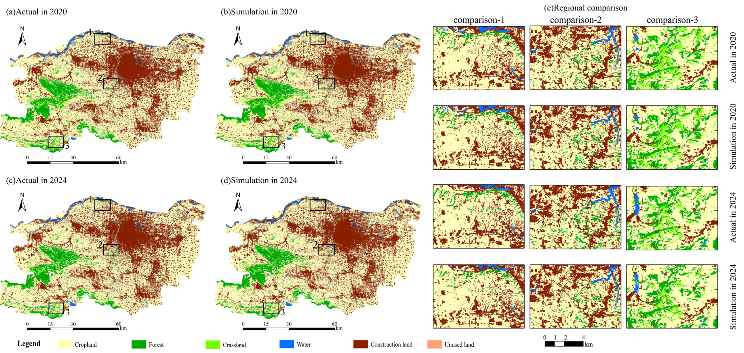 Based on land-use data from 2010 and 2015, land-use conditions for 2020 and 2024 were simulated, and accuracy validation was performed using actual data (Figure 5). The classification accuracy was evaluated using the confusion matrix method [50], with model performance assessed through user accuracy, producer accuracy, overall accuracy, and the Kappa coefficient. The Kappa coefficient reflects the agreement between the classification results and actual data [51]. The confusion matrices for the 2020 and 2024 land-use classifications are presented in Table 4. Further analysis indicated relatively low user accuracy for water bodies and unused land, suggesting that some areas categorised as such might have been misclassified, possibly due to confusion with unused land. The Kappa coefficients for the two validation years were 0.83 and 0.78, respectively, demonstrating the model’s strong simulation capability. This confirms that the model is suitable for simulating the spatial patterns of land use in Zhengzhou under three SSP-RCP scenarios for 2030 and 2040.