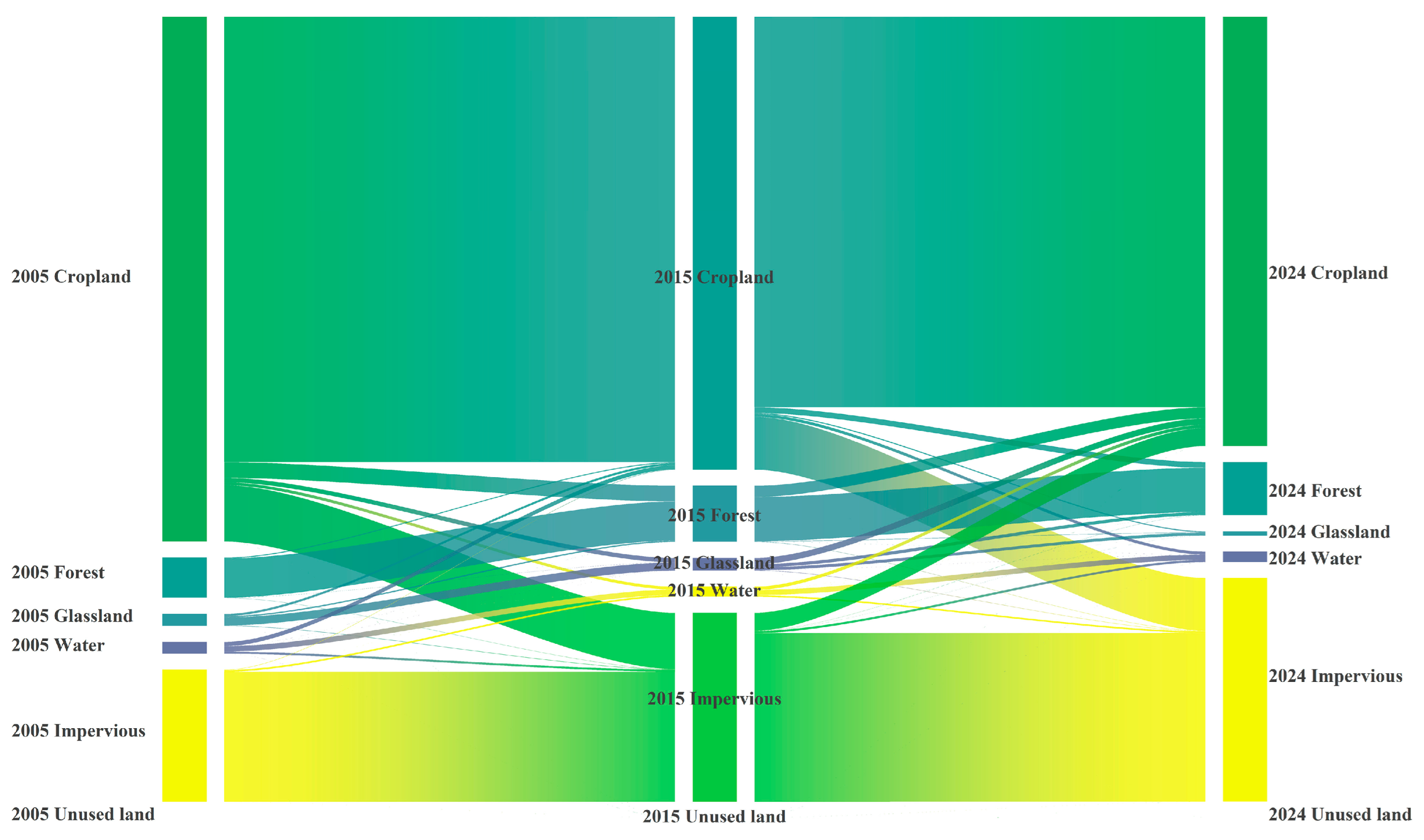 The evolution of land-use patterns in Zhengzhou City from 2005 to 2024 reveals notable trends (Figure 6). Cropland remains the dominant land-use category; however, it has experienced the most significant reduction in area. Specifically, the cropland area decreased from 5506.42 km2 to 4504.40 km2, leading to a net loss of 1002.01 km2. In contrast, construction land is the only land-use category that exhibited continuous growth throughout the study period, expanding substantially from 1389.93 km2 to 2300.97 km2. This resulted in a net increase of 910.38 km2, representing a substantial growth rate of 65.5%. This trend indicates that urban expansion has predominantly encroached upon cropland, posing a direct threat to regional food security and agricultural ecological functions.