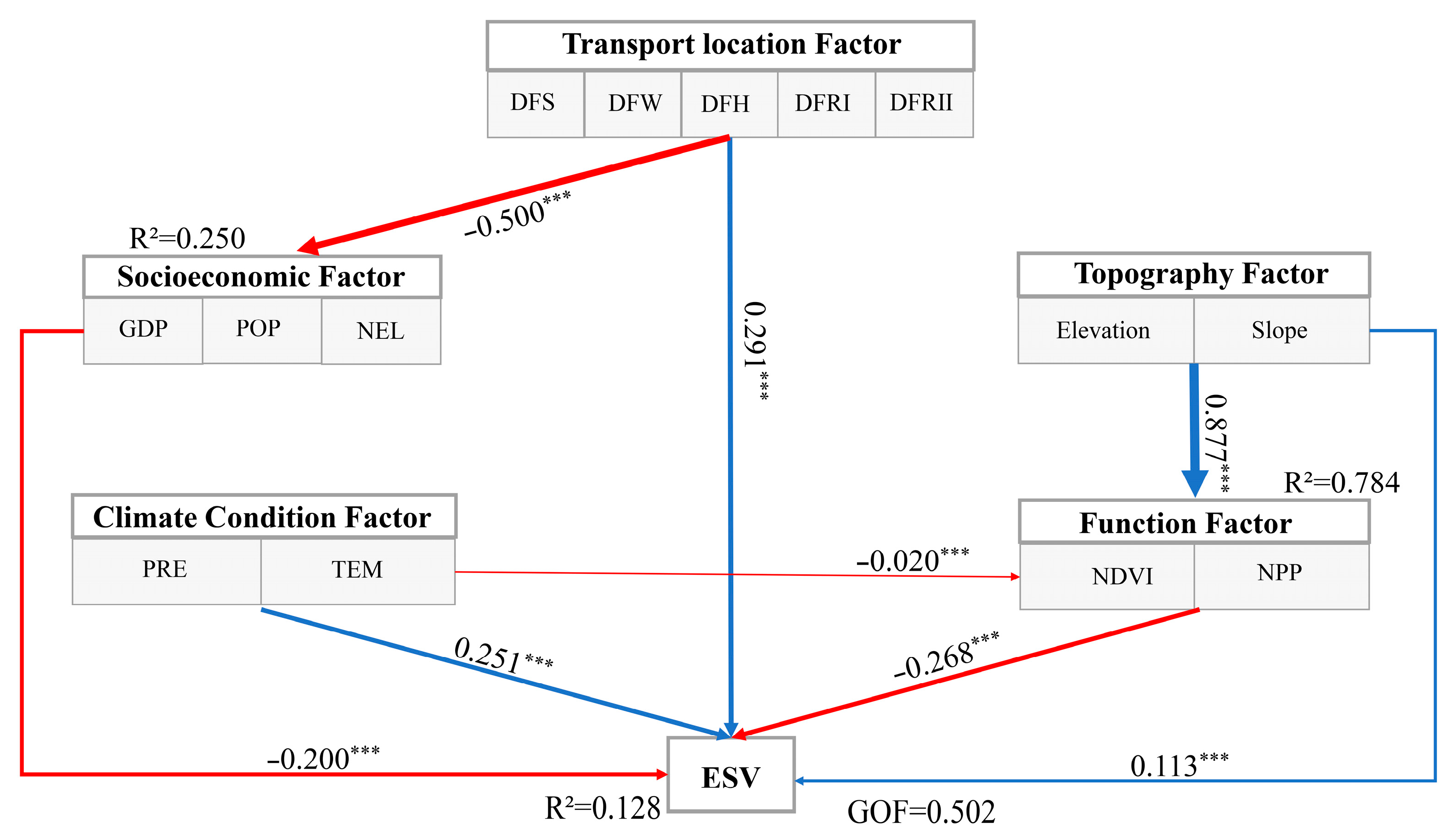 Partial Least Squares Structural Equation Modelling (PLS-SEM) is a variant of structural equation modelling, widely utilised to examine relationships among multiple variables [57], involving both latent and observed variables. In this study, to mitigate the adverse impact of excessive multiplicative variations between data points on final outcomes, all data were subjected to standardisation. External loading tests were conducted on 15 factors, and factors with loadings below 0.5 were excluded. Building on existing research [38,58], latent variables were classified into the following categories: Transport Location Factors (TLF), Socioeconomic Factors (SEF), Climate condition Factors (CCF), Environmental Function Factors (FF), and Topography Factors (TSF). The TLF included observed distances to water bodies, railway stations, highways, and primary/secondary urban thoroughfares; Socioeconomic factors include population, GDP, and nocturnal light; Climatic factors include temperature and precipitation; Environmental functional factors consist of net primary productivity and vegetation cover index; Topographic factors include elevation and slope gradient. The ‘plspm’ package in R4.3.3 was used for model construction.