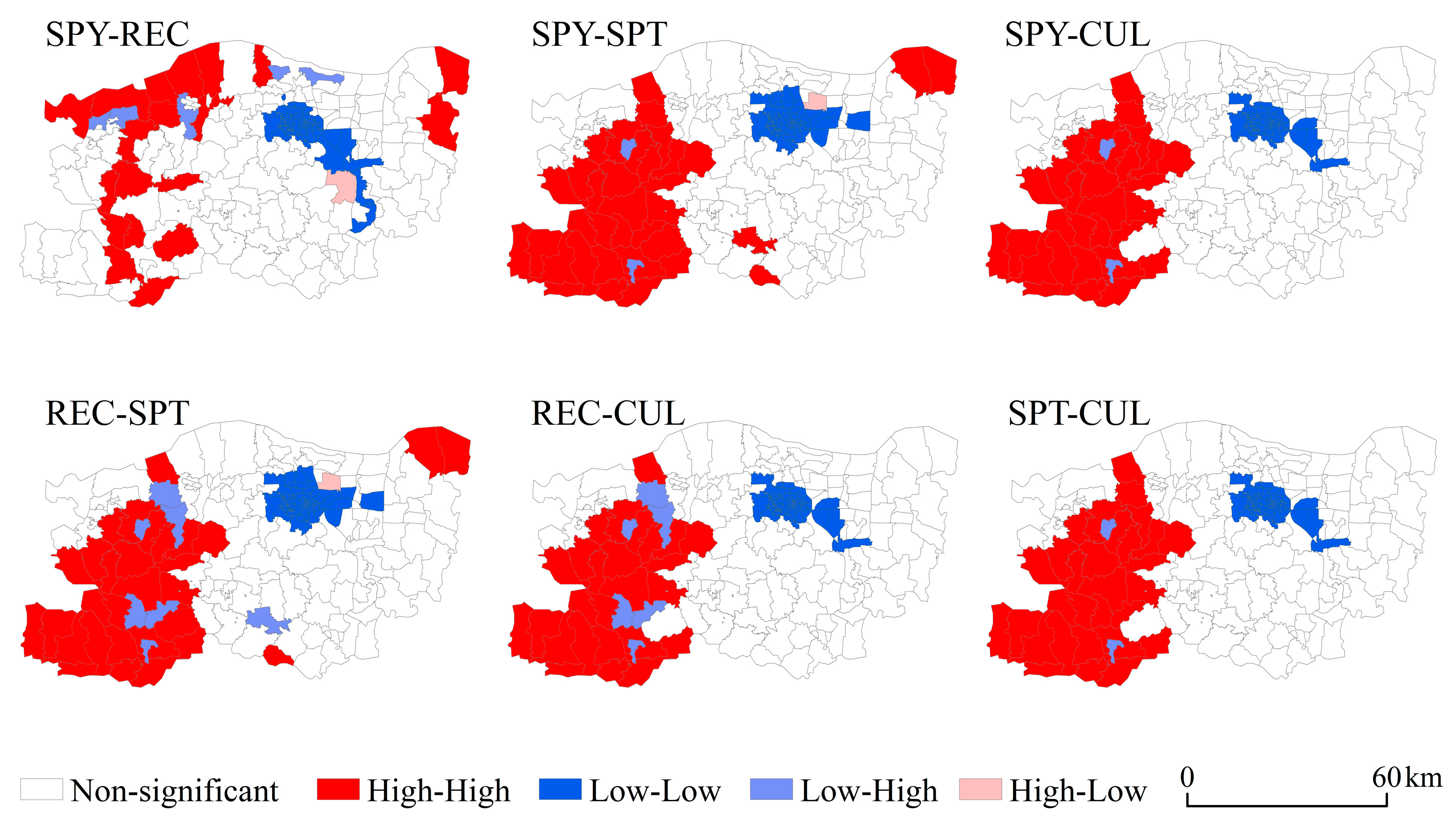 To understand their complex dynamics, this research employs Pearson correlation analysis alongside spatial autocorrelation techniques to uncover the trade-off and synergy relationships between pairs of ecosystem services [60]. Furthermore, bivariate local autocorrelation analysis is employed to examine the spatial patterns of clustering related to the trade-off and synergy interactions among ecosystem services [61]. Based on this method, a global autocorrelation analysis was performed for 2024.