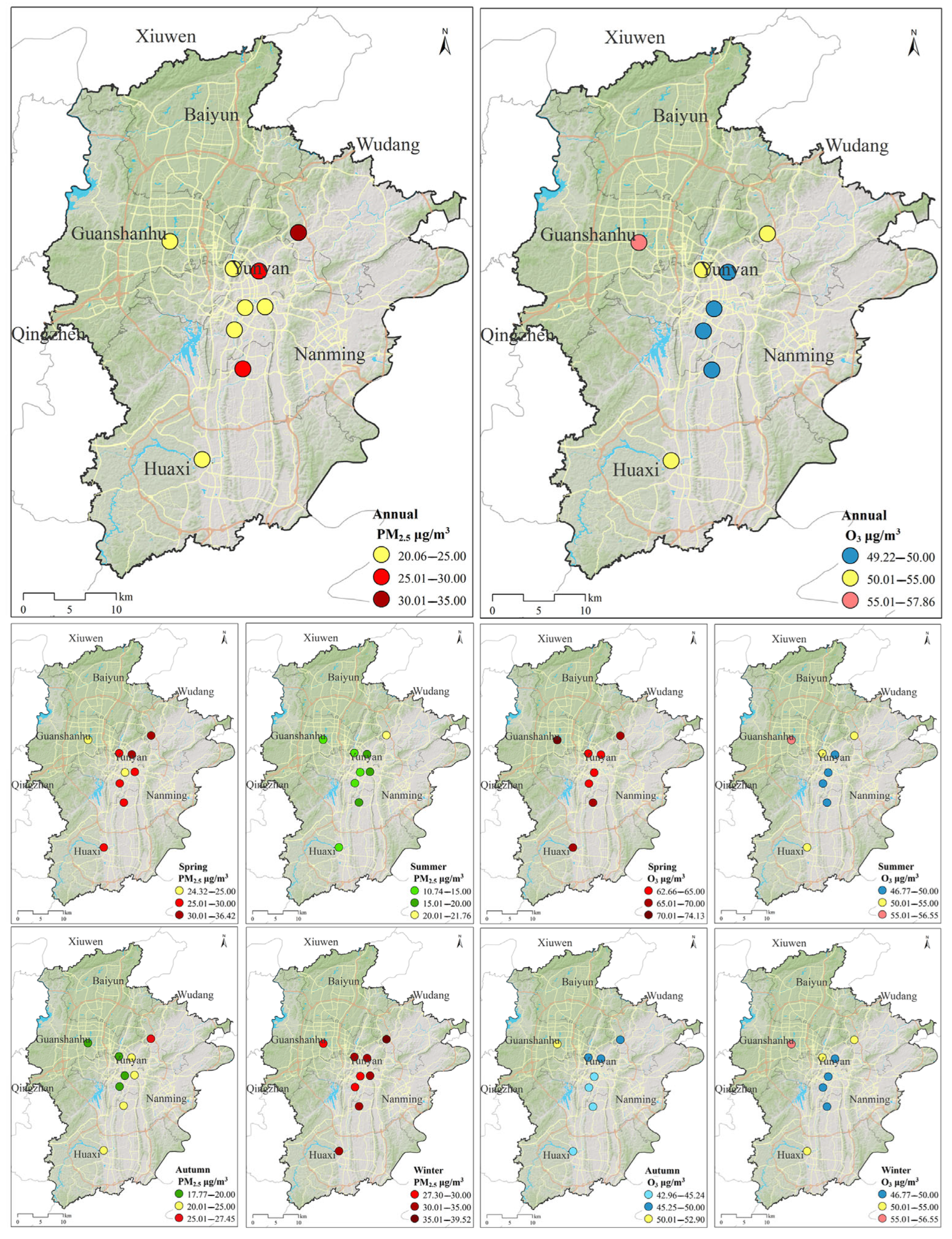 3.1. Spatiotemporal Patterns of PM2.5 and O3