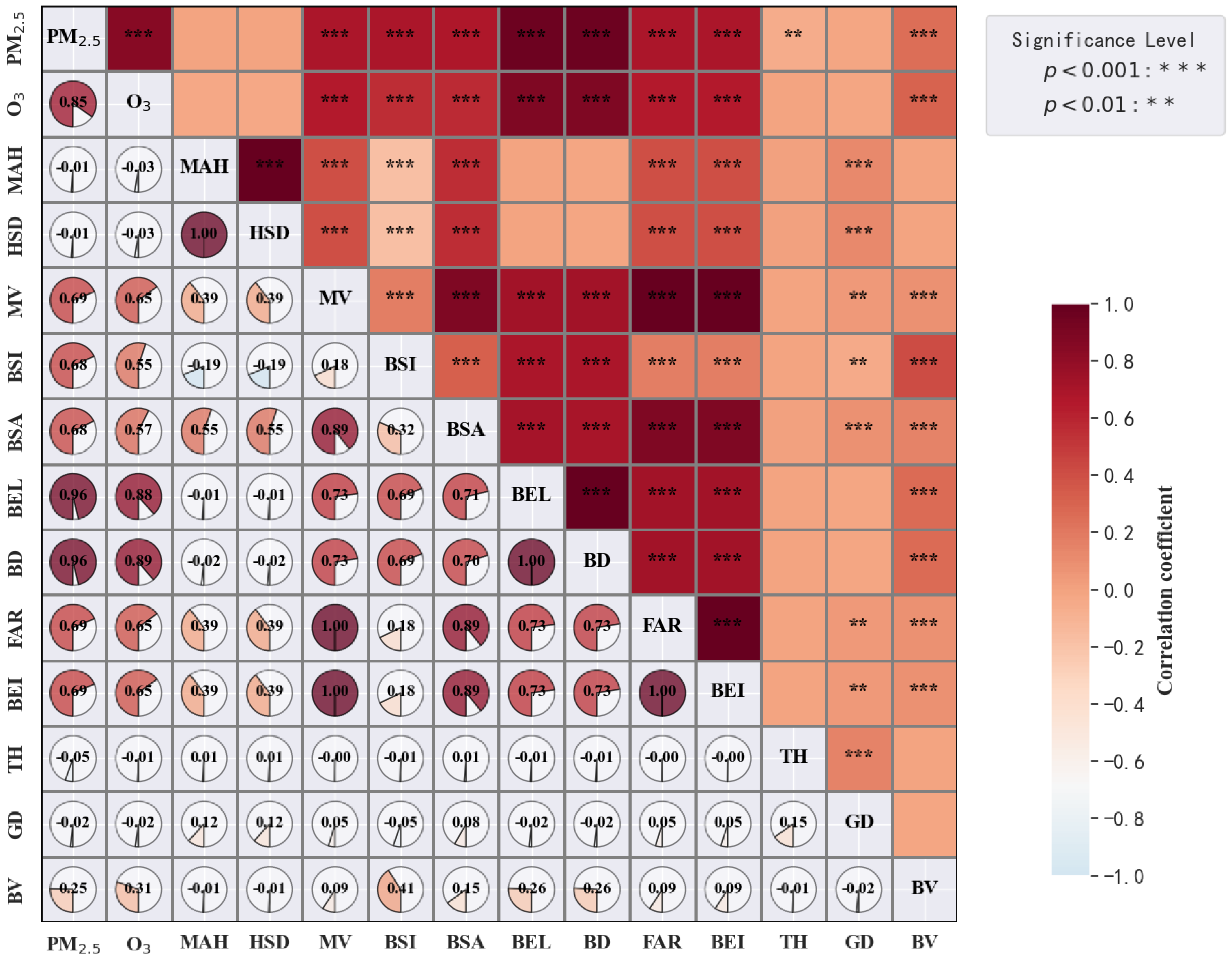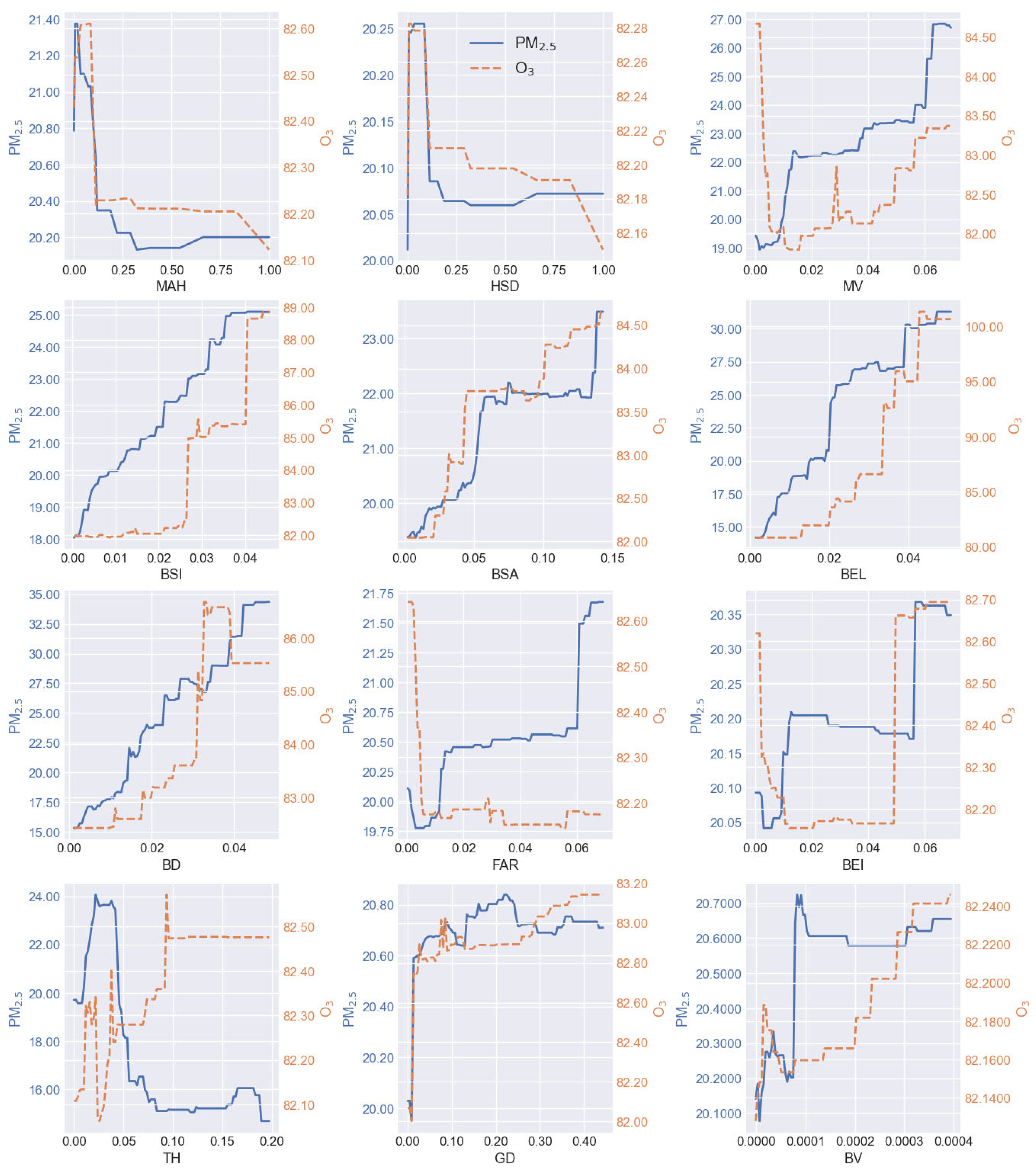 - Among the constructed indicators, MV, BSI, BSA, BEL, BD, FAR, and BV show significant positive correlations with both PM2.5 and O3 (p < 0.001), confirming that higher building density, volume, and structural complexity exacerbate pollution accumulation. In contrast, TH exhibits a significant negative correlation with PM2.5 (p < 0.001), emphasizing the role of urban vegetation in particulate matter removal.