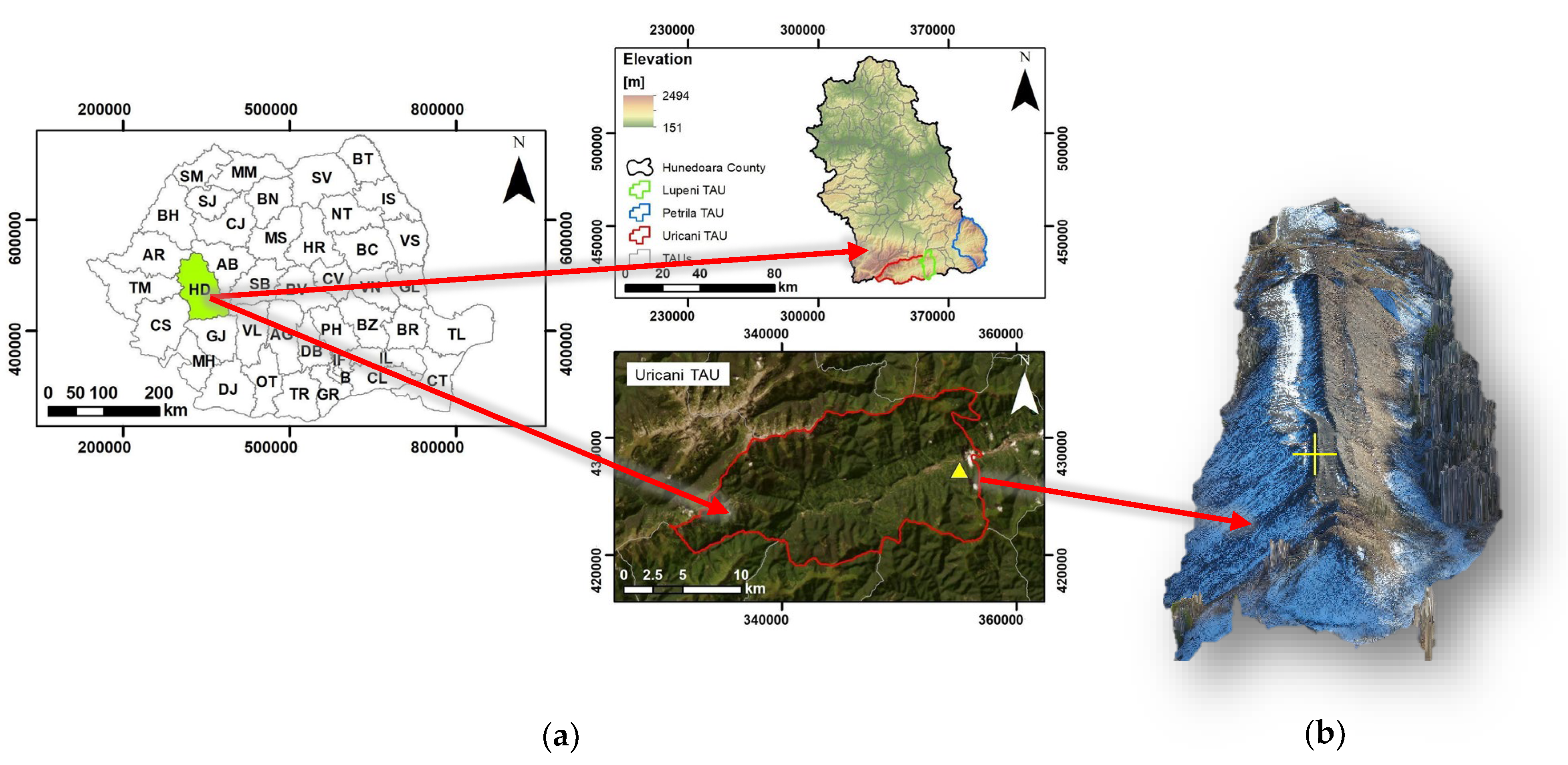 - Popescu, G.; Popescu, C.A.; Dragomir, L.O.; Herbei, M.V.; Horablaga, A.; Țenche-Constantinescu, A.M.; Sălăgean, T.; Bruma, S.; Dinu-Roman (Szabo), M.; Colisar, A.; et al. Utilizing UAV Technology and GIS Analysis for Ecological Restoration: A Case Study on Robinia pseudoacacia L. in a mine waste dump landscape rehabilitation. Not. Bot. Horti Agrobo. 2024, 52, 13937. [Google Scholar] [CrossRef]