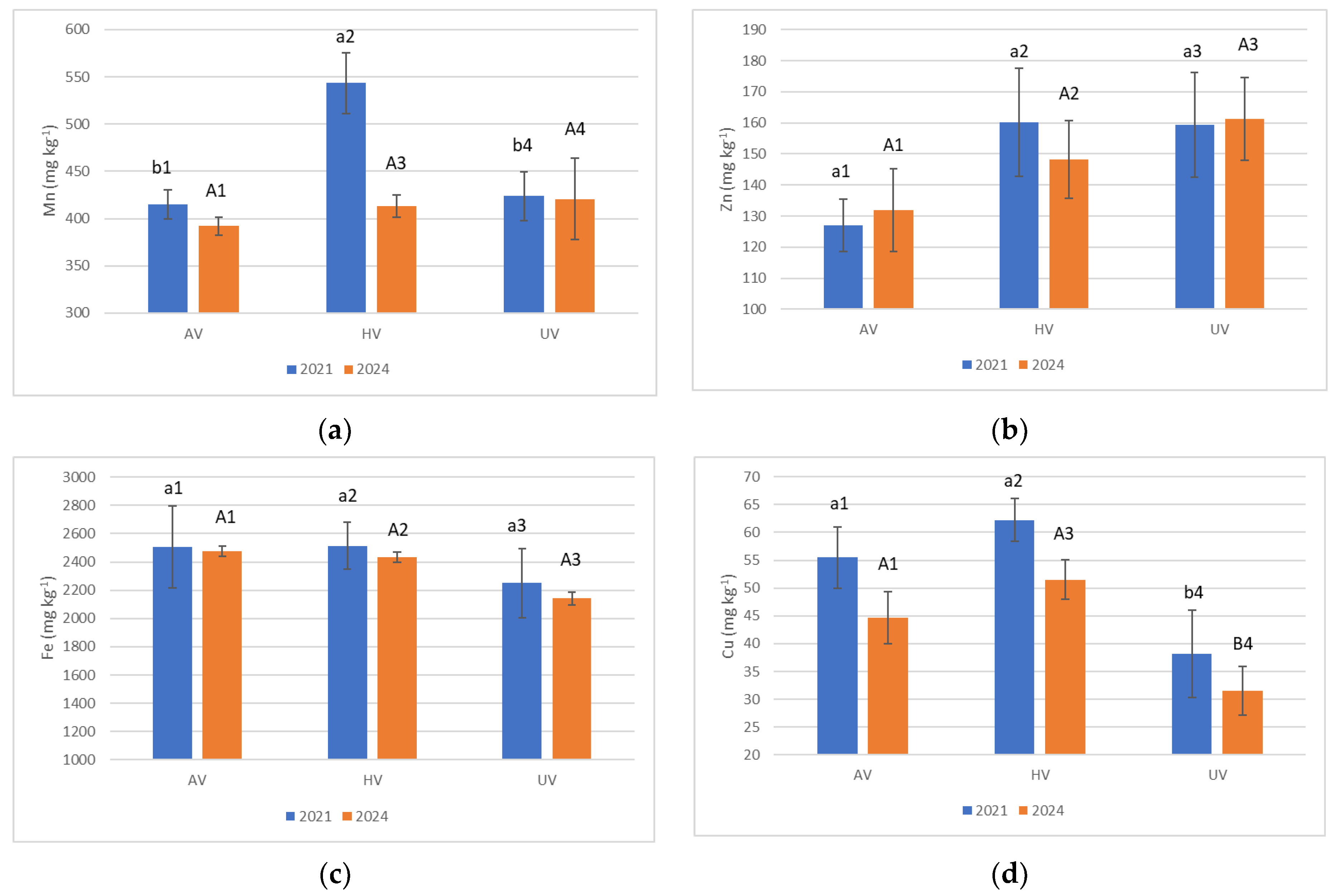 | Mgav (mg kg−1) | 2021 | 323 ± 33 b5 | 758 ± 46 a1 | 682 ± 57 a3 |