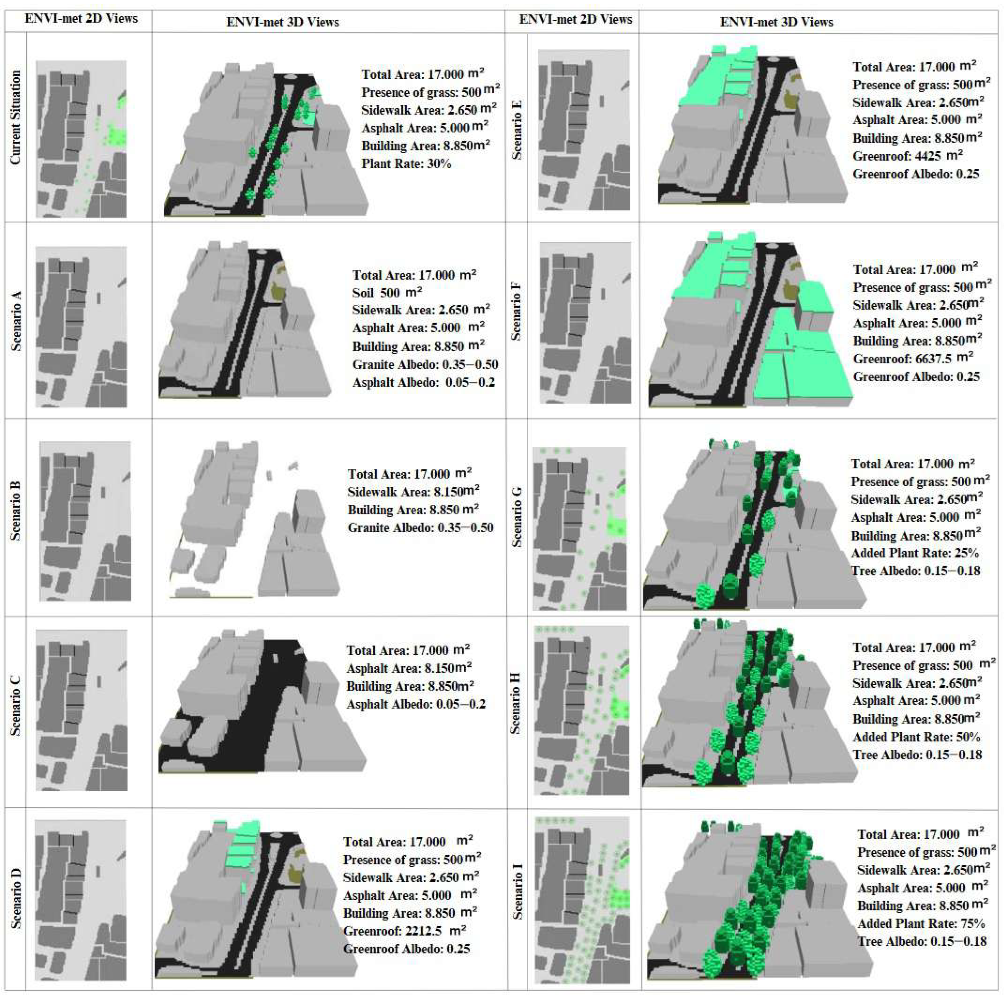 | Scenario E | Green roof on adjacent buildings (extensive system, 50% coverage). |