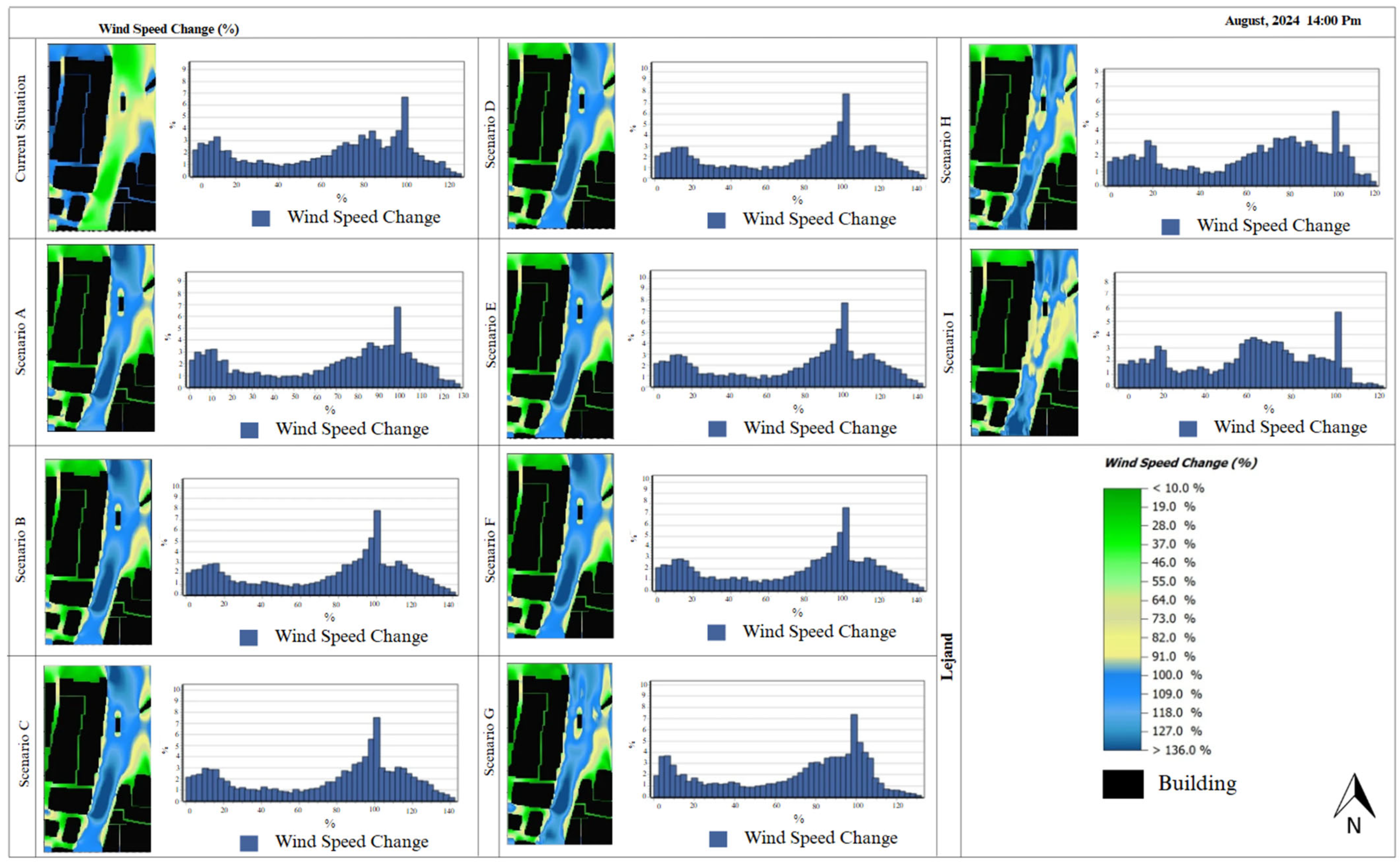 | [39] | Erzurum, Turkey | Aug, Jan, 2021 | 90 × 100 m | Four landscape scenarios were tested, showing that adding plants reduced summer temperatures by 0.2 °C, deciduous trees improved, and inactive water increased wind speed up to 1.3 m/s. |