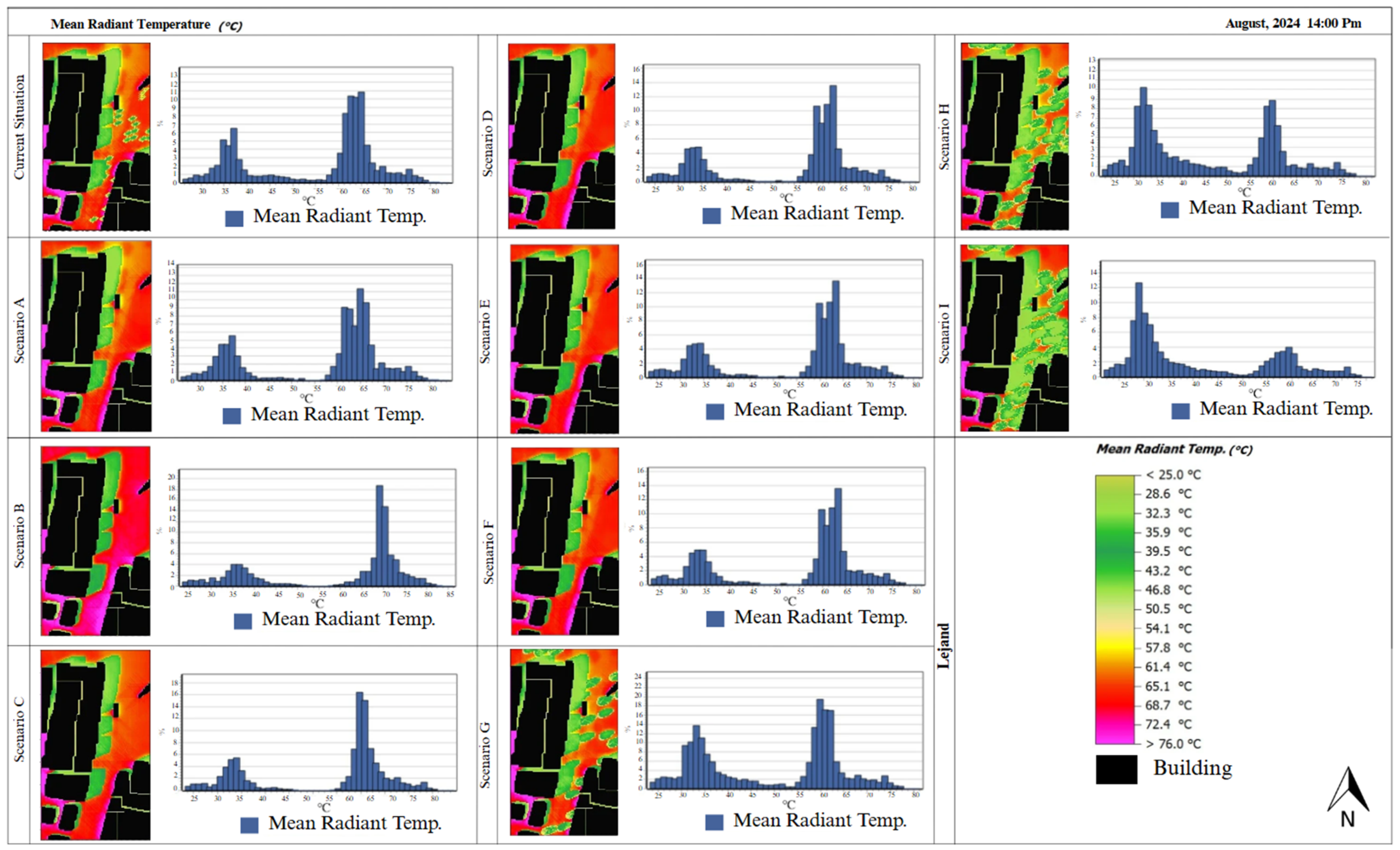 | [40] | Kuala Lumpur | 16–20 Aug | 255 × 270 m | The study revealed that as a result of replacing facades with high albedo materials and afforestation, there were decreases in air temperature and Tmrt values, and the PET value worsened. |