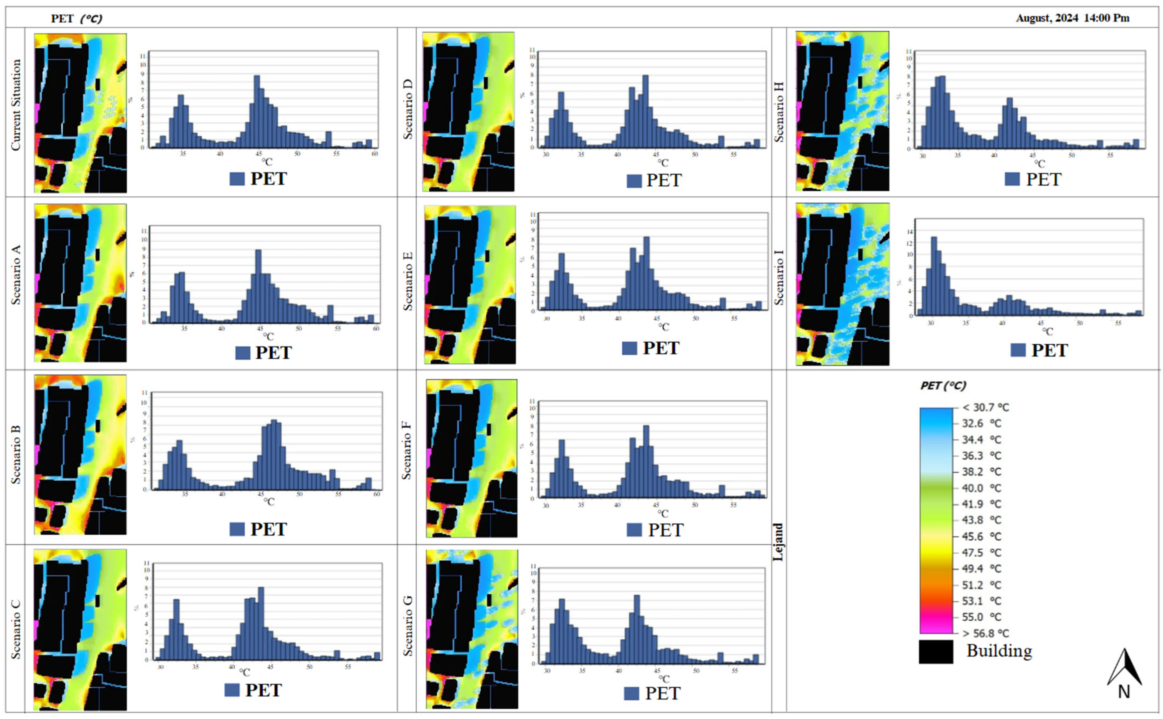 | [37] | Shenzhen, China | 10 Jun 2019 | 300 × 300 m | This study created twelve different scenarios for the study area, Kanyon Street. The study found that the scenario with intensive greenery on the facades near pedestrian level had PET values between −3.15 and 0.12 °C. |