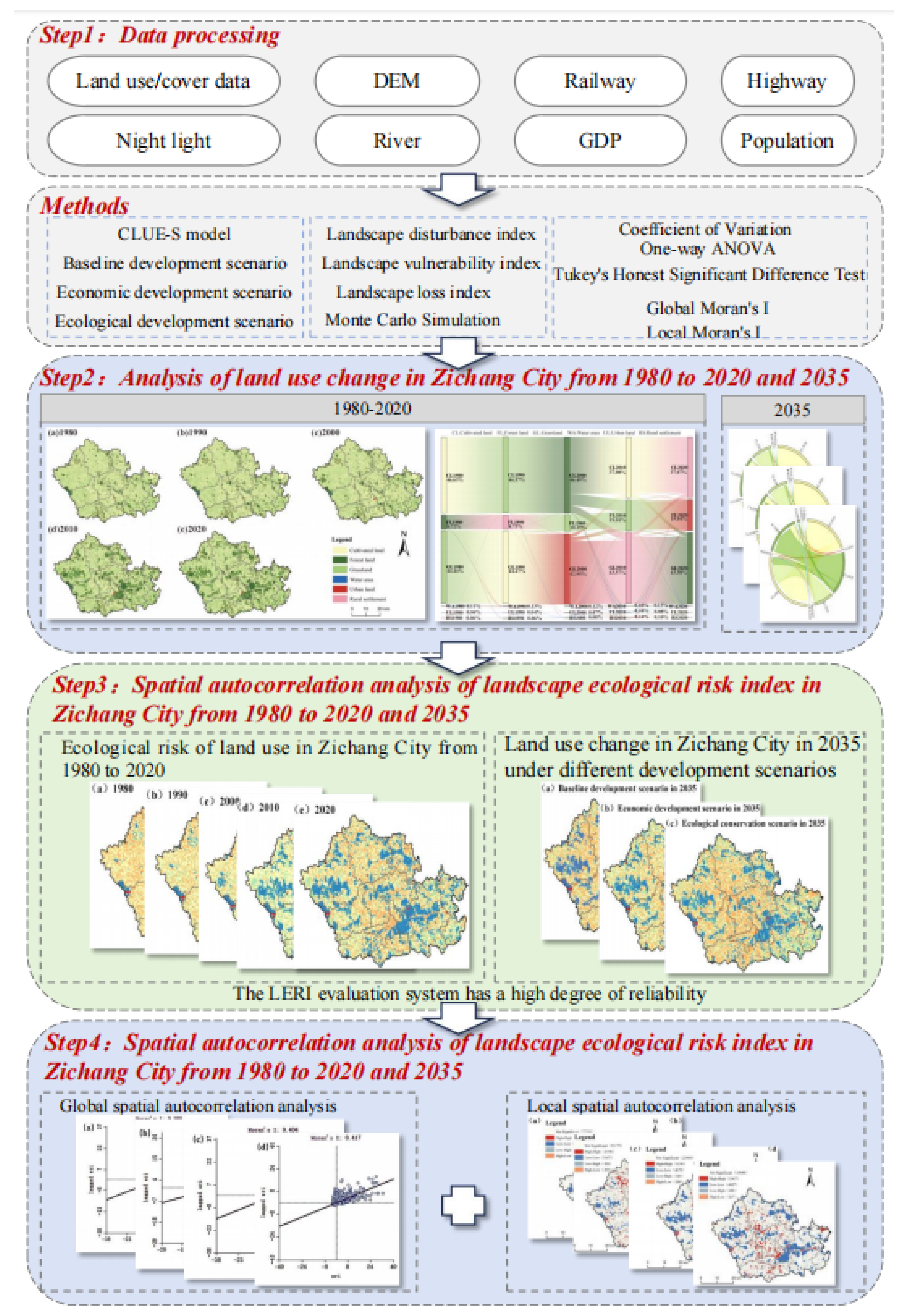 The assessment of landscape ecological risk in Zichang City encompassed land use change analysis, scenario-based simulation, and ecological risk evaluation (Figure 2). The assessment of landscape ecological risk in Zichang City encompasses land use change analysis, scenario-based simulation, and ecological risk evaluation (Figure 2). Initially, a detailed examination of land use/cover change (LULC) was conducted, providing a foundational basis for subsequent modeling. Thereafter, the Landscape Ecological Risk Index (LERI) was calculated, enabling comparisons with historical periods and facilitating an in-depth analysis of ecological risk dynamics under different scenarios. Finally, the spatial clustering patterns of landscape ecological risk were further examined, forming the basis for proposing targeted strategies for ecological risk prevention.