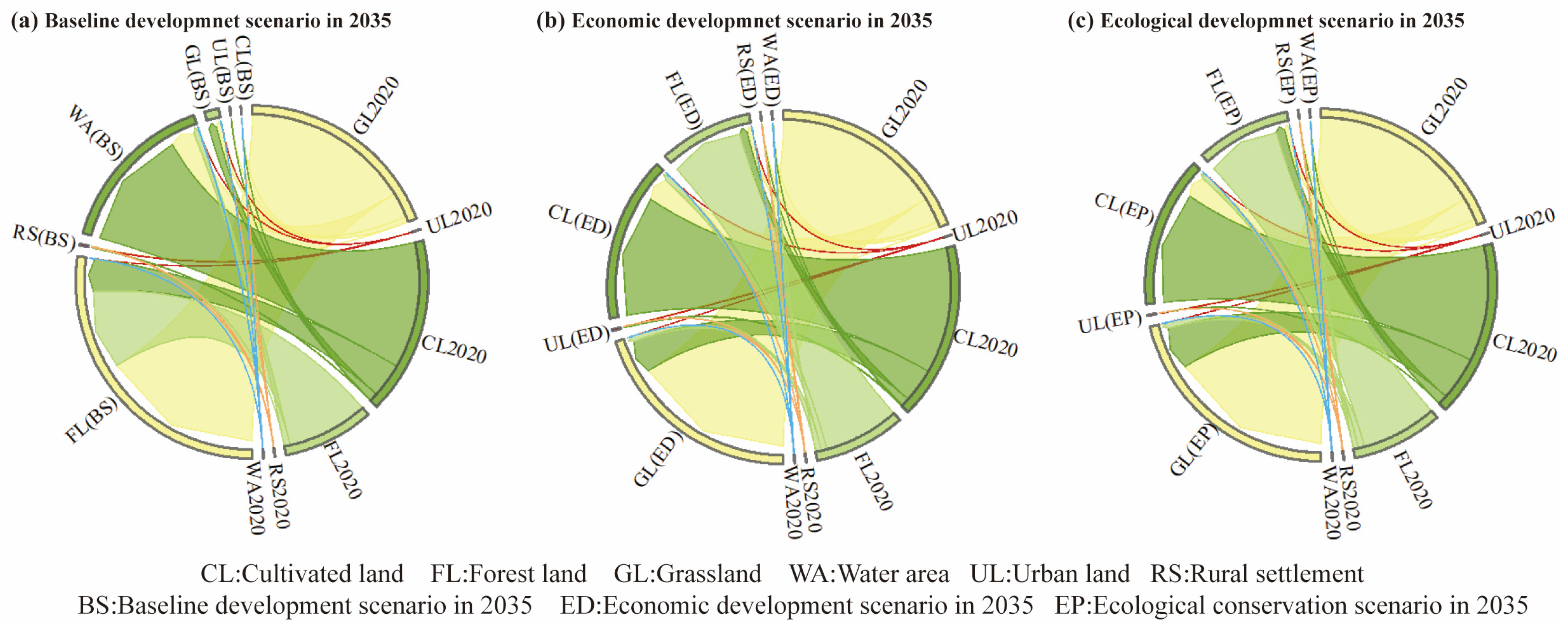 Under the economic development scenario, urban expansion is prioritized to support economic growth. The probabilities of converting cropland, forest, and grassland to urban land are increased by 60%, 50%, and 30% relative to the baseline, respectively, while transfer probabilities among other land types remain largely unchanged.