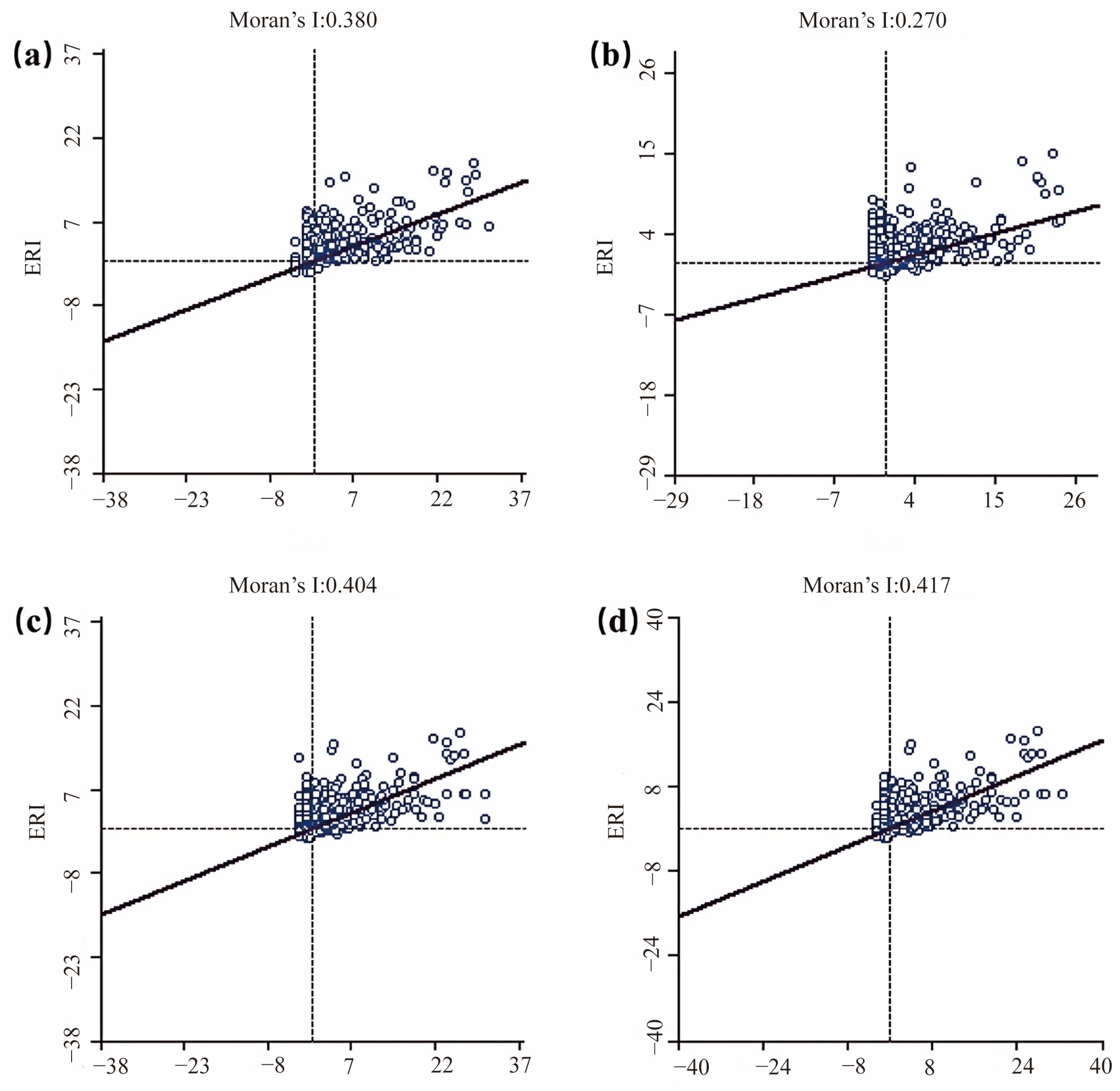 Figure 9. Moran Scatter Plots of Landscape Ecological Risk in Zichang City for 2020 and 2035 under Different Scenarios. Note: (a) Moran scatter plot of landscape ecological risk in Zichang City for 2020; (bd) represent the Moran scatter plots of landscape ecological risk in Zichang City for 2035 under the baseline development, economic development, and ecological protection scenarios, respectively.