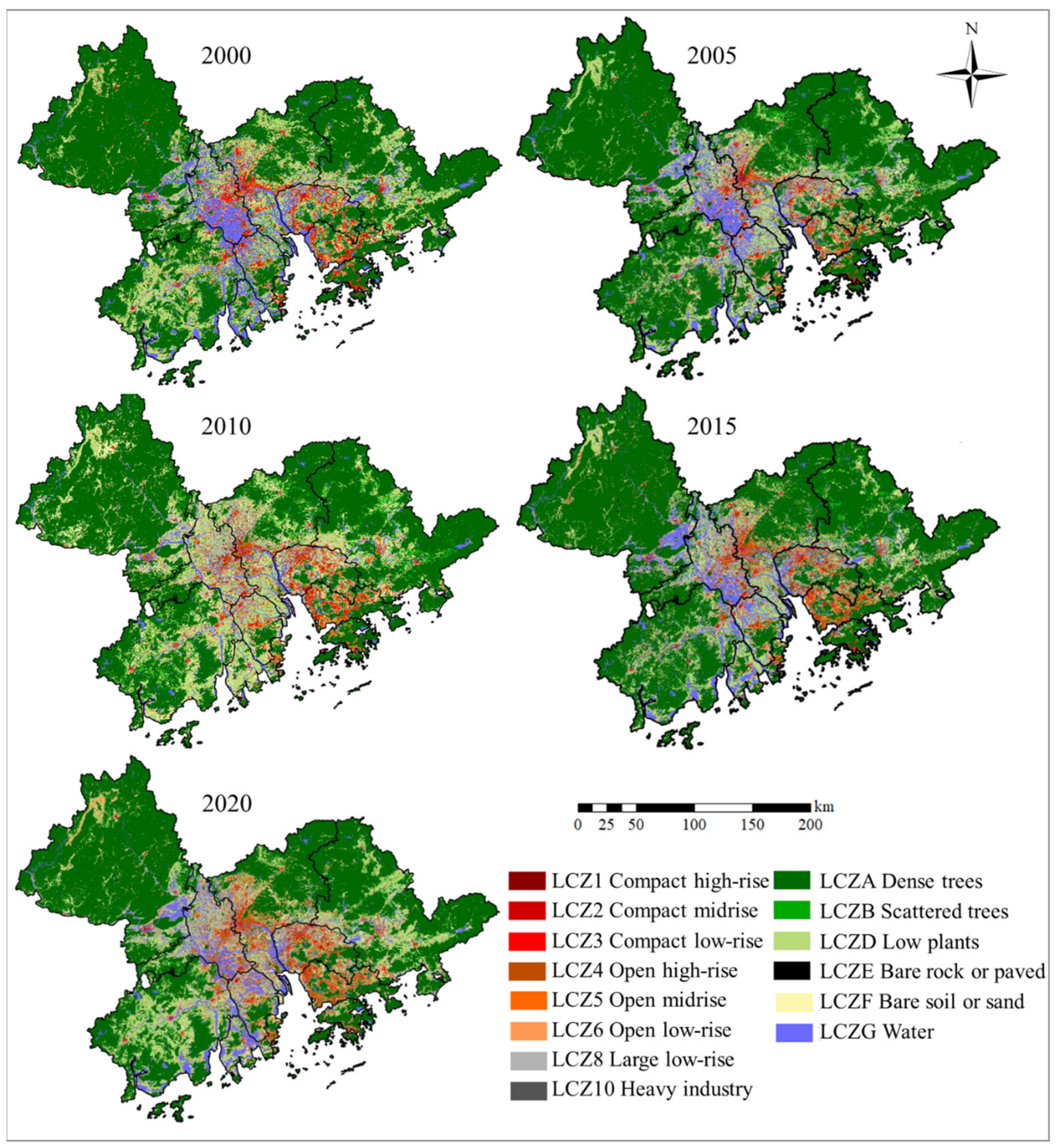 - Xie, J.; Ren, C.; Li, X.; Chung, L.C.H. Investigate the urban growth and urban-rural gradients based on local climate zones (1999–2019) in the Greater Bay Area, China. Remote Sens. Appl. 2022, 25, 100669. [Google Scholar] [CrossRef]