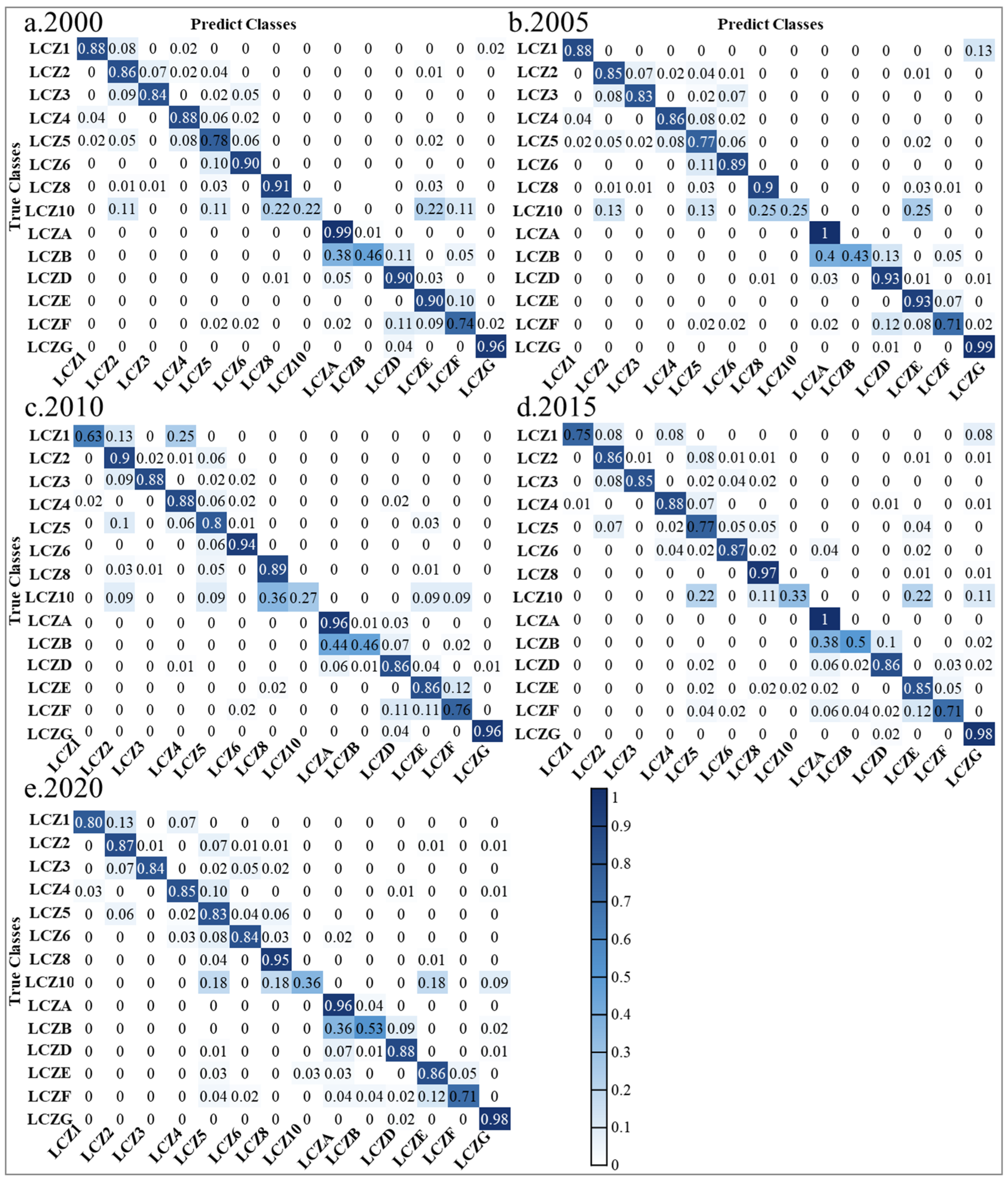 3.1. LCZ Mapping Accuracy and Spatiotemporal Characteristics of LCZ Changes