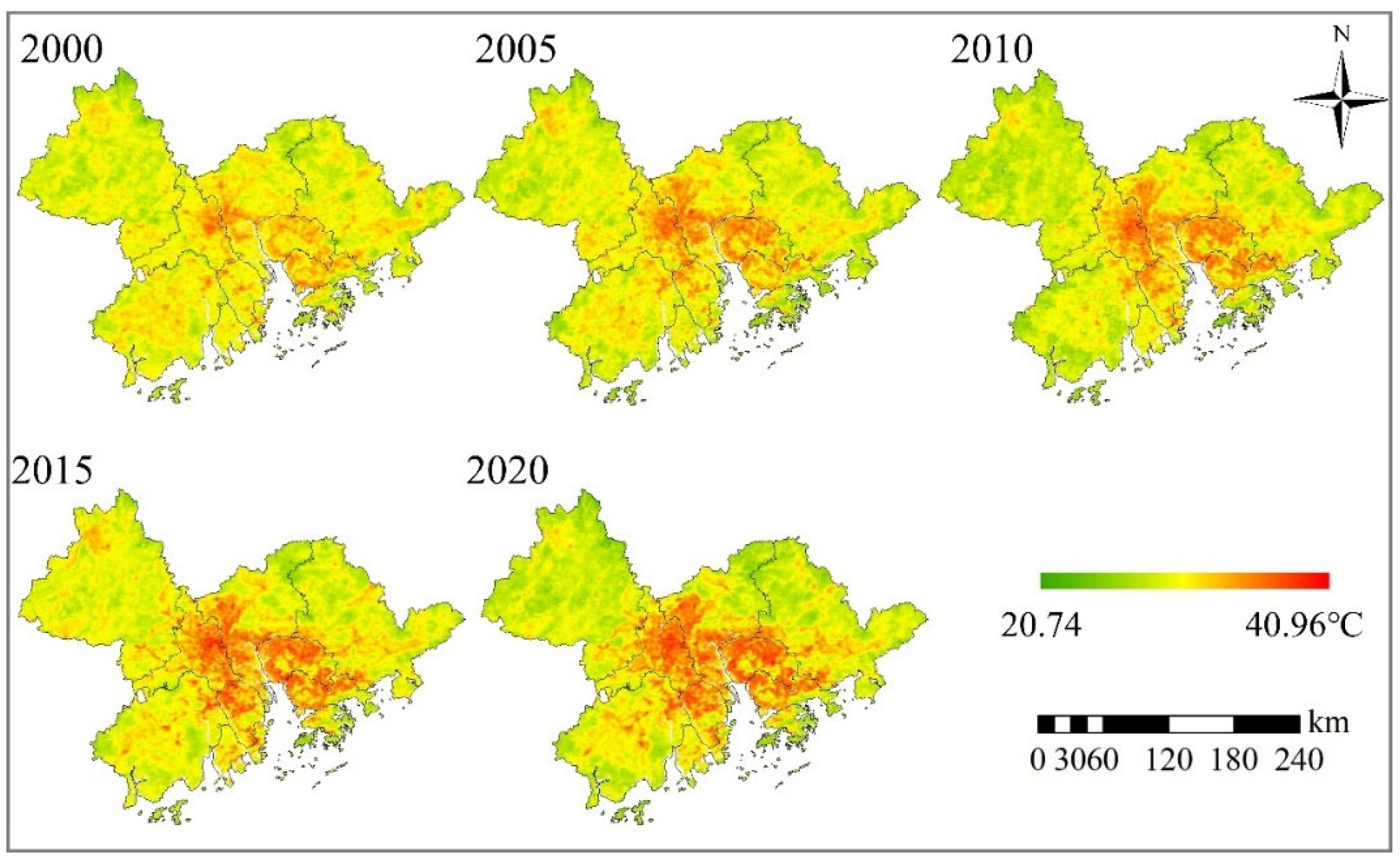 - Yujiao, D.; Yaodong, D.; Jiechun, W.; Jie, X.; Weisi, X. Spatiotemporal characteristics and driving factors of urban heat islands in Guangdong-Hong Kong-Marco Greater Bay Area. Chin. J. Ecol. 2020, 39, 2671–2677. [Google Scholar]