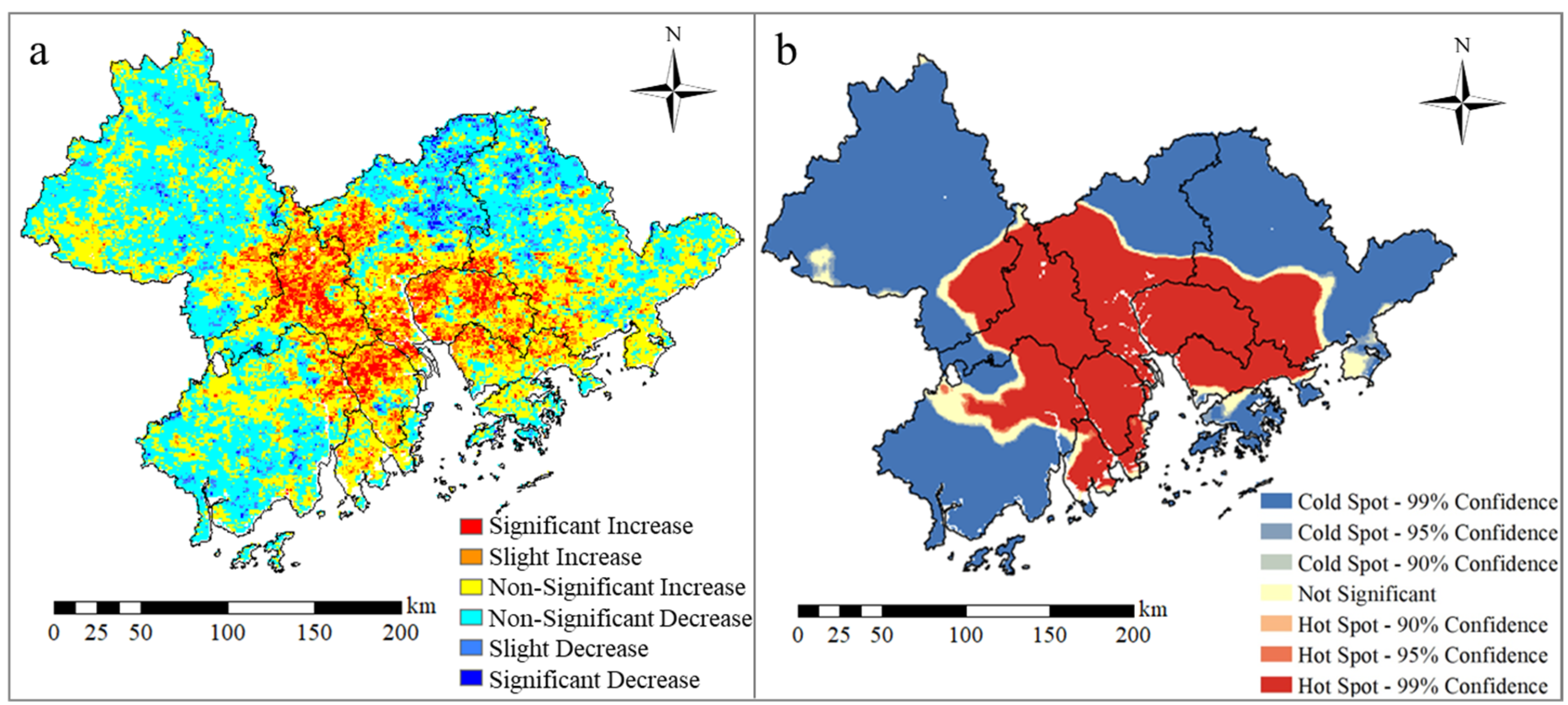 2.2. Sen + Mann–Kendall Analysis of LST Trends