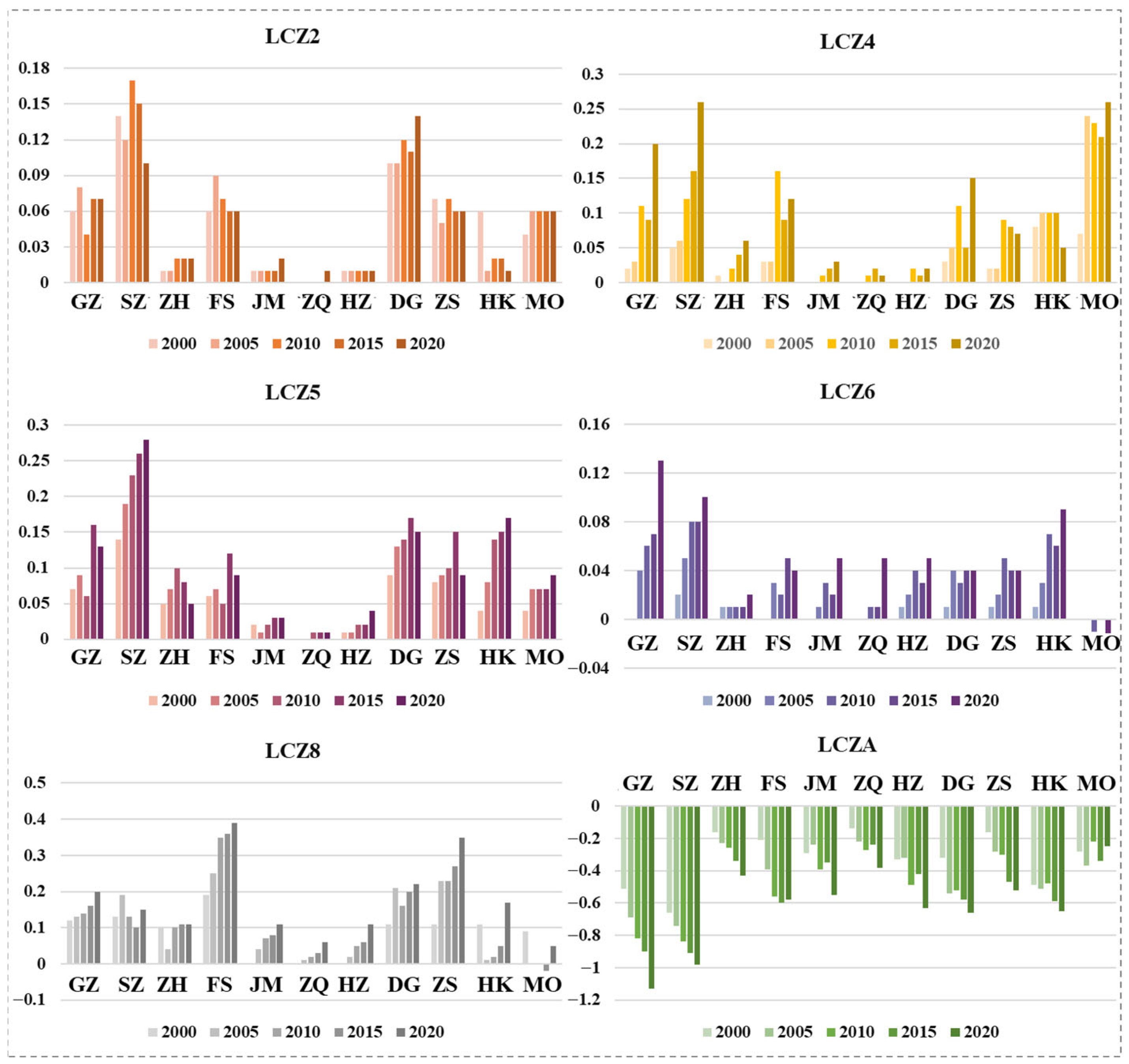 - Lu, Y.; Yang, J.; Ma, S. Dynamic Changes of Local Climate Zones in the Guangdong–Hong Kong–Macao Greater Bay Area and Their Spatio-Temporal Impacts on the Surface Urban Heat Island Effect between 2005 and 2015. Sustainability 2021, 13, 6374. [Google Scholar] [CrossRef]