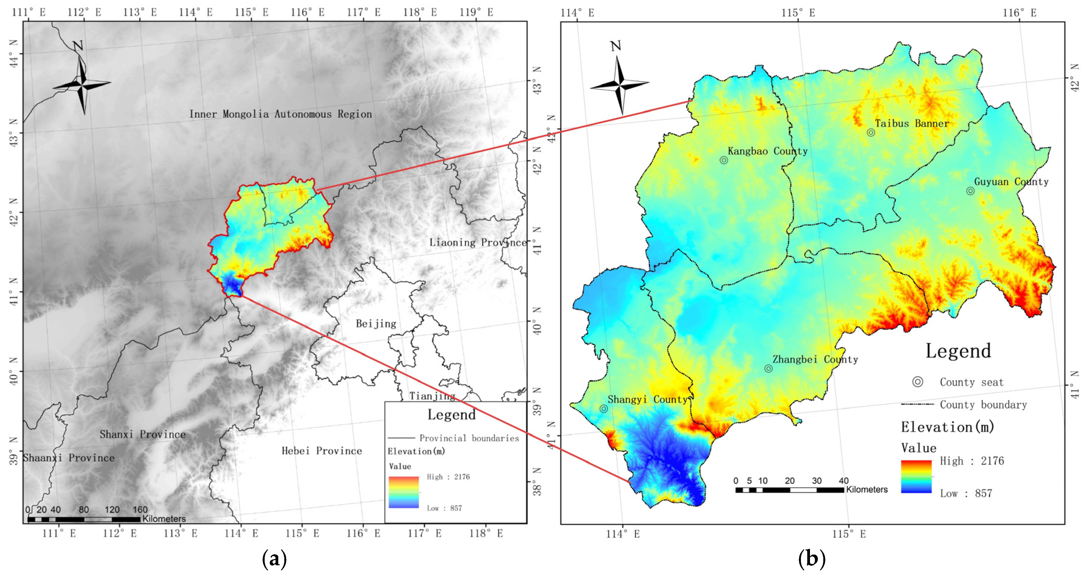 Figure 1. Spatial location and elevation of the Zhangbei region. (a) Location of the study area within northern China, showing its position on the transition zone between the Mongolian Plateau and the northern edge of the North China Plain. (b) Elevation distribution and county boundaries (Shangyi County, Zhangbei County, Kangbao County, Guyuan County, and Taibus Banner) within the Zhangbei region. Elevation ranges from 857 m (blue) to 2176 m (red).