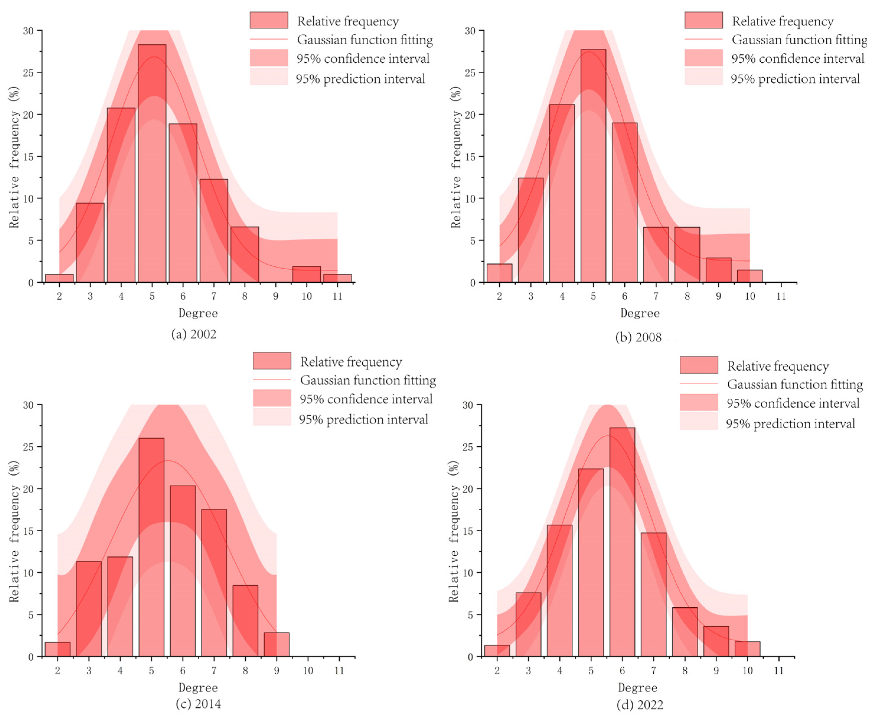 Figure 6. Temporal evolution of the Degree Distribution of the ESN from 2002 to 2022. The subplots represent the Degree statistics for (a) 2002, (b) 2008, (c) 2014, and (d) 2022. Red bars indicate the relative frequency of node Degrees. The continuous red curve represents the Gaussian function fitting, suggesting that the network topology approximates a random graph structure. The dark and light pink shaded regions denote the 95% confidence interval and 95% prediction interval, respectively. The uni-modal distribution indicates a homogeneous network connectivity with no extreme hubs.