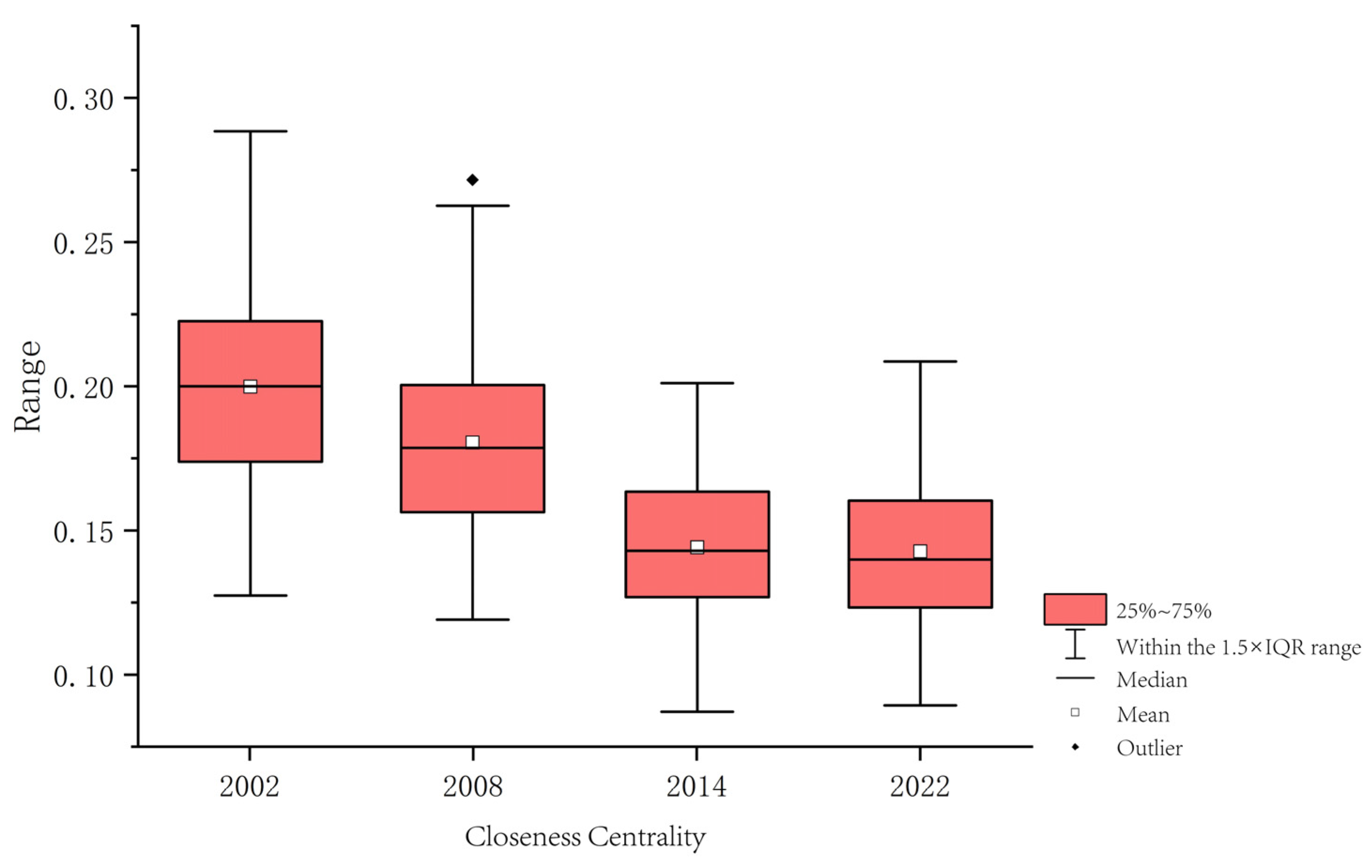 Figure 7. Temporal variation in Closeness Centrality values in the ESN (2002–2022). The boxplots quantify the statistical distribution for each year. The red boxes represent the interquartile range (25–75%), the internal solid lines mark the median, and the hollow squares denote the mean values. The overall downward trend indicates a decrease in the global compactness of the network.