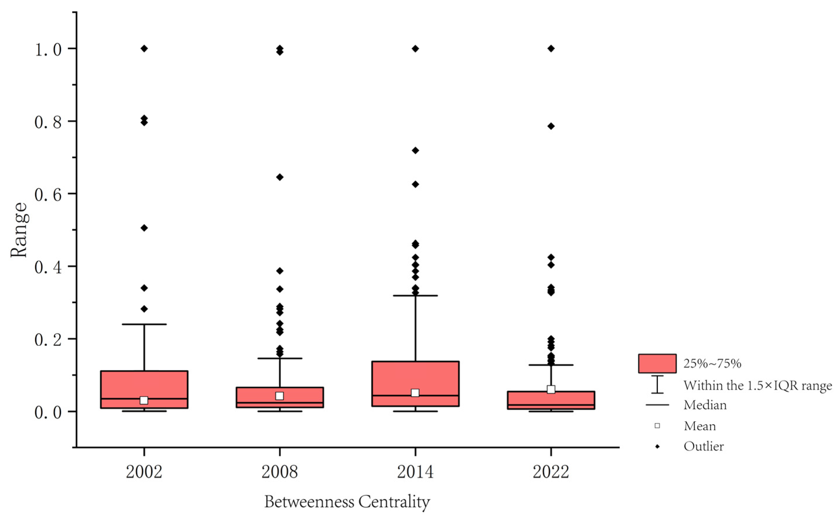 Figure 10. Temporal evolution of node importance (PageRank) in the ESN from 2002 to 2022. The boxplots illustrate the decreasing average influence and the narrowing disparity between nodes over time. The red boxes represent the interquartile range (25–75%), the solid horizontal lines mark the medians, and the hollow squares indicate the mean values. The converging trend reflects the “dilution effect” of core nodes and a shift towards a more decentralized network structure.