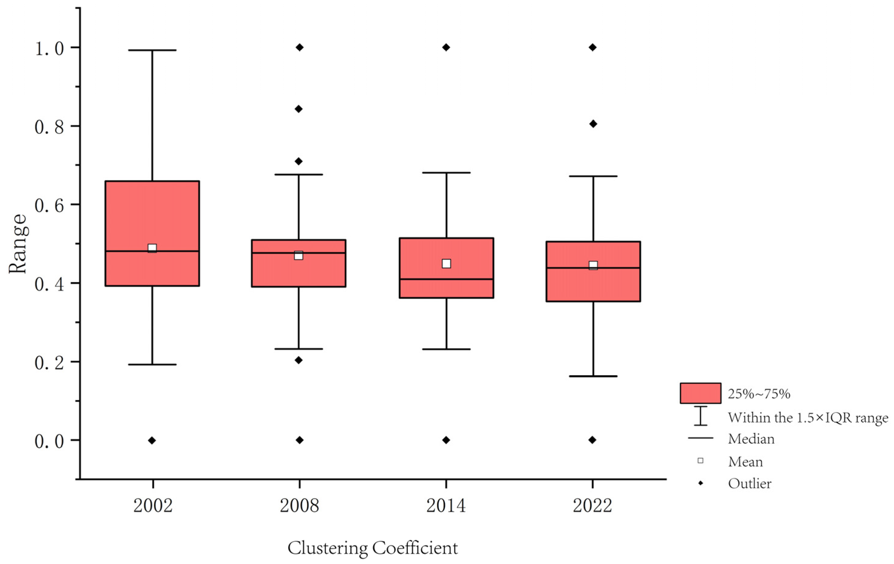Figure 11. Temporal evolution of the Clustering Coefficient in the ESN from 2002 to 2022. The boxplots illustrate the distribution of local network connectivity. The relatively high values (mostly >0.4) indicate a strong clustering tendency, while the slight downward trend in mean values (hollow squares) suggests a gradual loosening of local ecological clusters as the network expands.