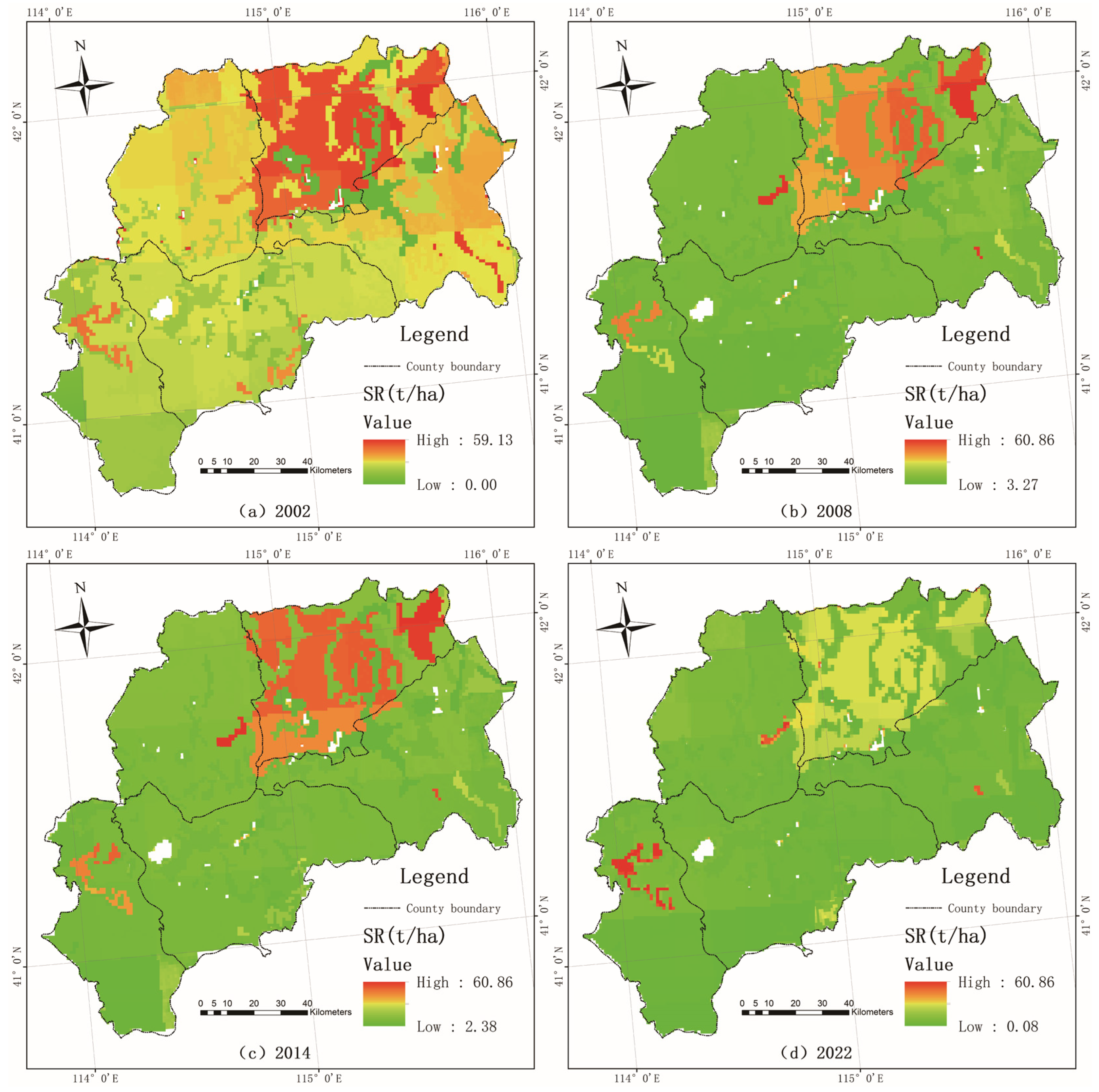 Figure 13. Spatiotemporal distribution of SR in the study area from 2002 to 2022. The subplots display the SRs for (a) 2002, (b) 2008, (c) 2014, and (d) 2022, which were calculated assuming no vegetation cover. The color gradient represents the severity of potential erosion, where red indicates high SR values and green indicates low SR values.