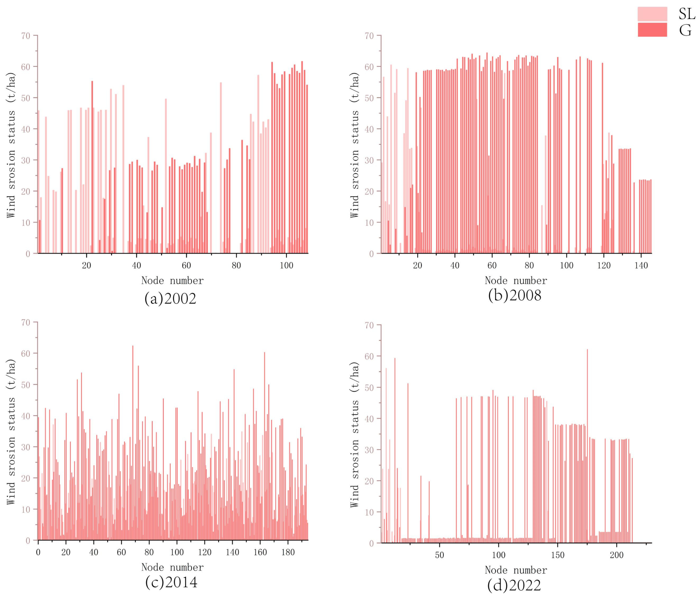 Figure 16. Statistical characteristics of S L and G for ecological source patches in the Zhangbei region. The bar charts illustrate the wind erosion status of each identified ecological source node in (a) 2002, (b) 2008, (c) 2014, and (d) 2022. The dark red bars represent G , while the light pink bars represent S L .