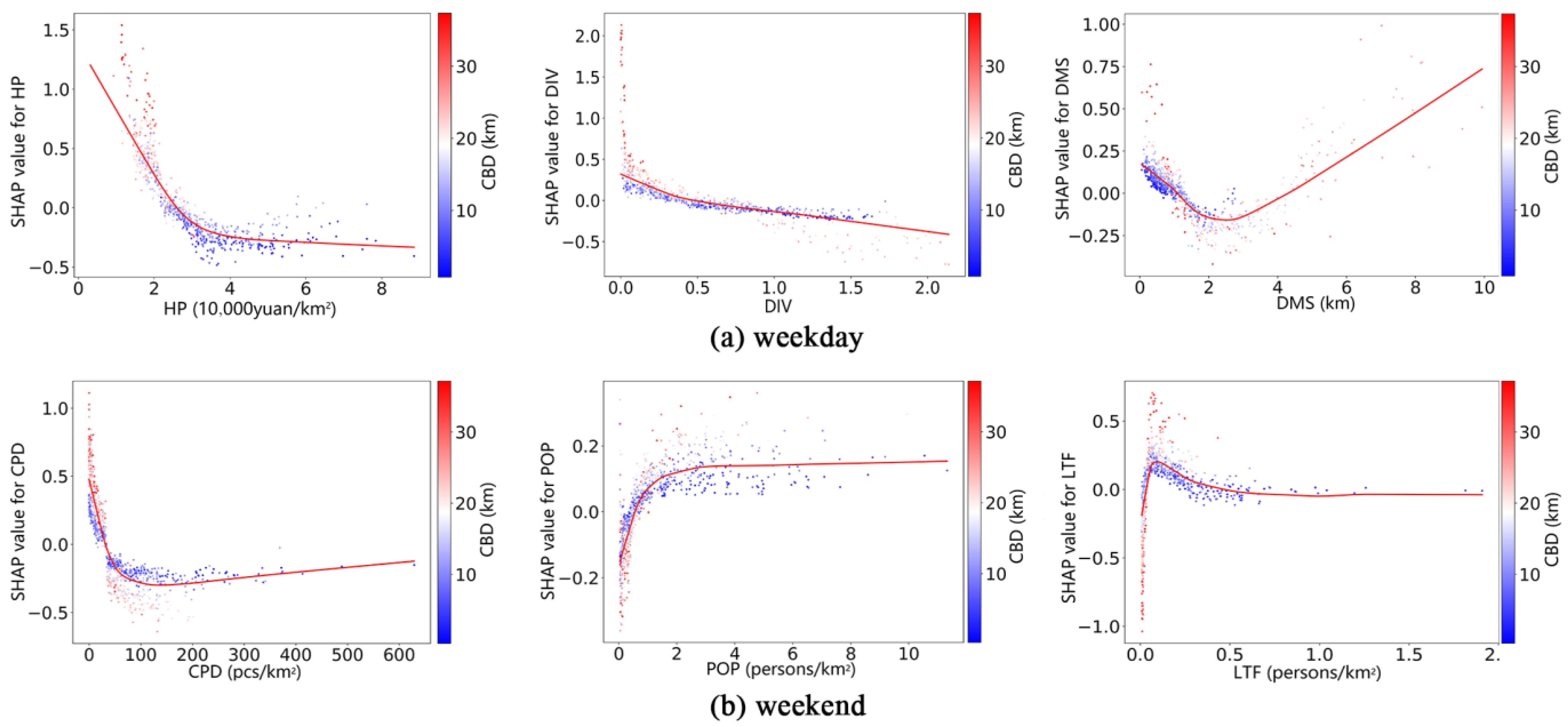| Socioeconomic attributes | Housing price (10,000 yuan/m2) | HP | Average housing price within spatial units, derived using Kriging spatial interpolation | 2.860 | 1.216 |