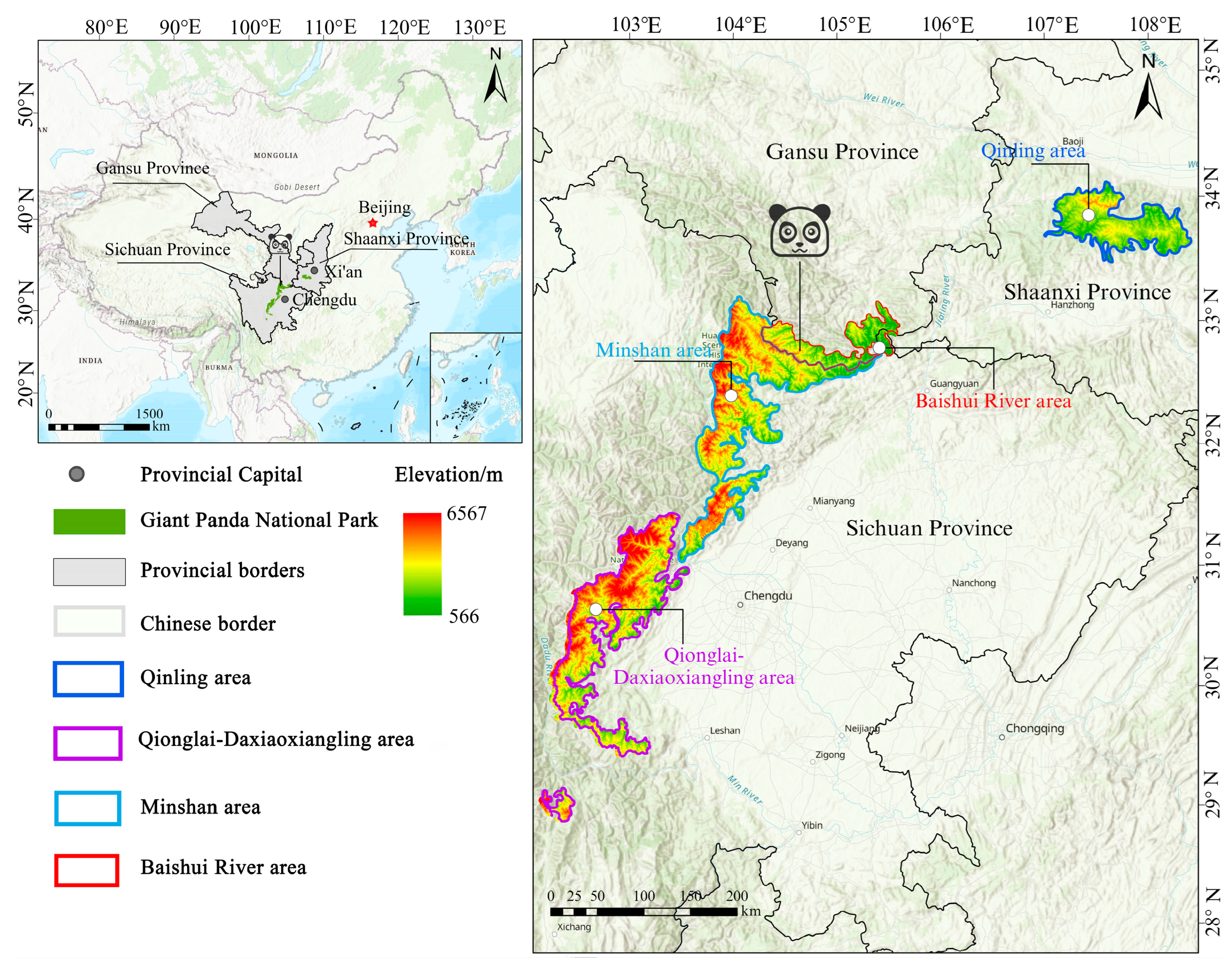 The GPNP is situated in western China (102°11′10″–108°30′52″ E, 28°51′03″–34°10′07″ N), extending across the provinces of Gansu, Sichuan, and Shaanxi. It comprises four major subregions, including Qinling, Baishuijiang, Minshan, and Qionglai–Daxiaoxiangling, and lies within one of the world’s biodiversity hotspots as well as the core area of China’s ecological security framework, commonly referred to as the “Two Barriers and Three Belts” strategy [41]. The park is distinguished by unique geomorphological, biotic, and habitat features. The planned area of GPNP covers 27,134 km2 across 3 provinces, 12 prefecture-level cities, and 30 counties [42]. The region is situated within a transitional monsoon climate zone, lying between the northern subtropical and warm temperate regions. The prevailing climate is humid, characterized by abundant and uneven precipitation that generally varies between 500 and 1200 mm per year [43]. Rainfall tends to be more concentrated during the summer and autumn months, particularly in the southwestern part of the park, and gradually decreases toward the northeast. The annual mean temperature typically ranges from 12 °C to 16 °C, with historical extremes recorded between –28 °C and 37.7 °C [44,45]. Elevation spans from 566 to 6567 m (Figure 1), forming a vertical difference of nearly 6000 m. The terrain is generally higher in the southwest and lower in the northeast, forming distinct vertical vegetation zones. As the altitude increases, the dominant vegetation transitions from subtropical evergreen broadleaf forests and deciduous broadleaf forests to mixed evergreen and deciduous broadleaf forests, then to temperate coniferous forests, alpine coniferous forests, shrublands, and alpine meadows [46]. The soils are diverse, encompassing mountain brown, yellow-brown, paddy, fluvo-aquic, and cinnamon mountain soils. The institutional development of GPNP has proceeded in phases. In August 2017, China approved the Pilot Scheme for the GPNP System, officially initiating the pilot phase. On 12 October 2021, the GPNP was formally established.
