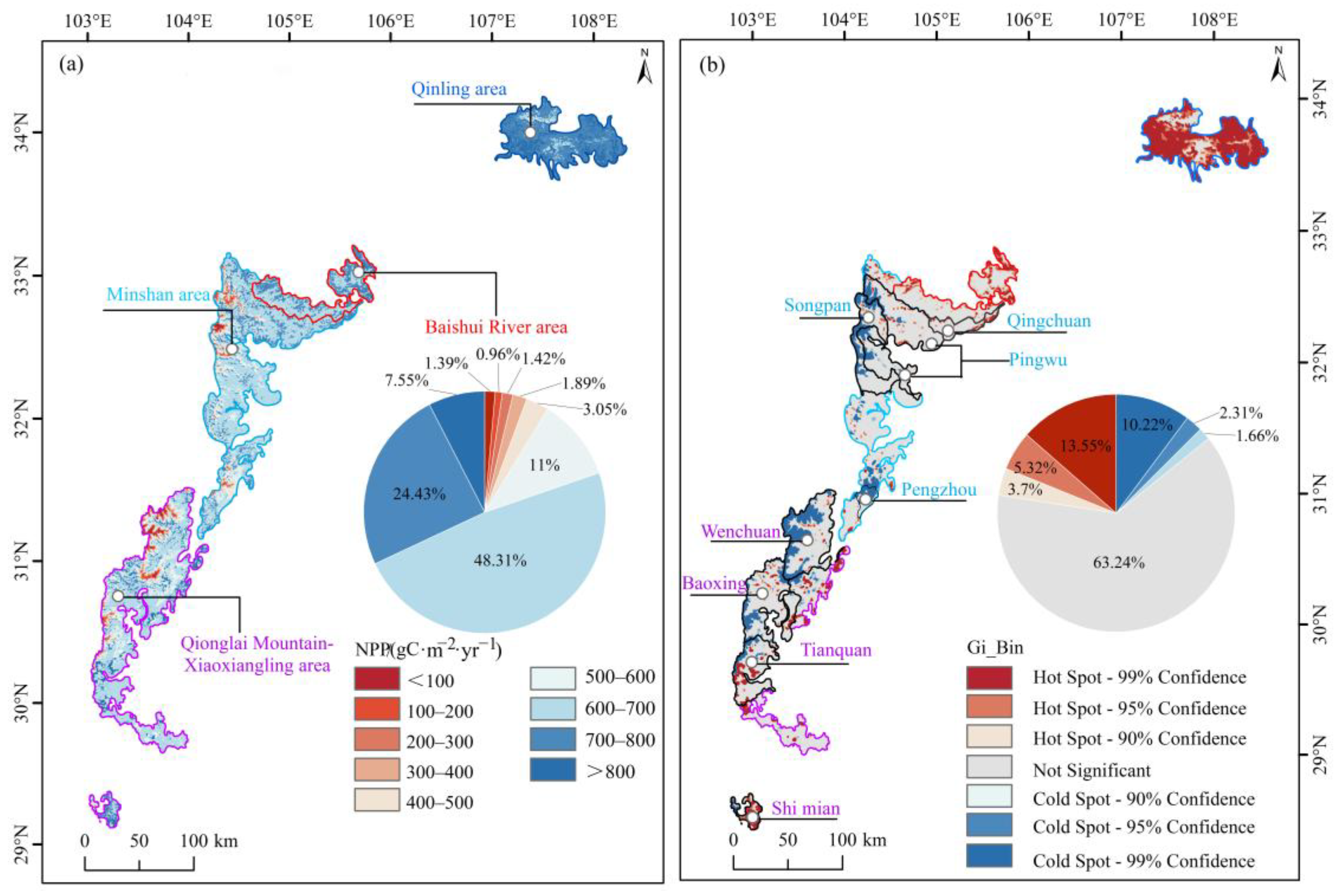 This study employed the CASA model, spatial statistical methods, and the Geographical Detector to systematically estimate vegetation NPP and explore its driving mechanisms in the GPNP during 2001–2023. The findings revealed a generally rising trajectory in NPP, with a mean annual increase of 0.65 gC·m−2·yr−1, reflecting the beneficial impacts of ecological restoration initiatives and the establishment of the national park on overall ecosystem productivity. However, marked spatial heterogeneity was observed. Among them, Taibai and Zhouzhi Counties in the Qinling subregion and Wenchuan County in the Qionglai–Daxiaoxiangling subregion showed the most significant NPP growth. The central and western parts and some high-altitude areas were still in relatively low values, reflecting the constraints of terrain complexity and environmental conditions on productivity patterns.
