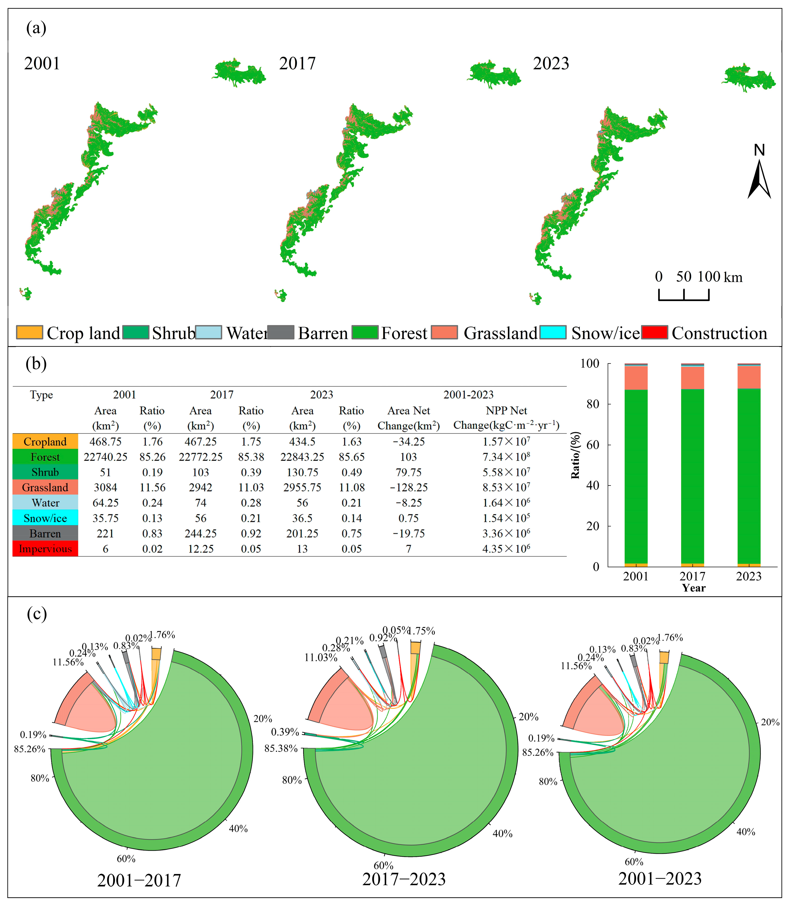 Figure 8. Sankey diagram of land use transitions in the Giant Panda National Park from 2001 to 2023. (a) Spatial distribution of land use types in 2001, 2017, and 2023; (b) Area and proportion of different land use types in 2001, 2017, and 2023, and the net changes in each land use category during the 2001–2023 period; (c) Land use transitions during 2001–2017, 2017–2023, and 2001–2023.