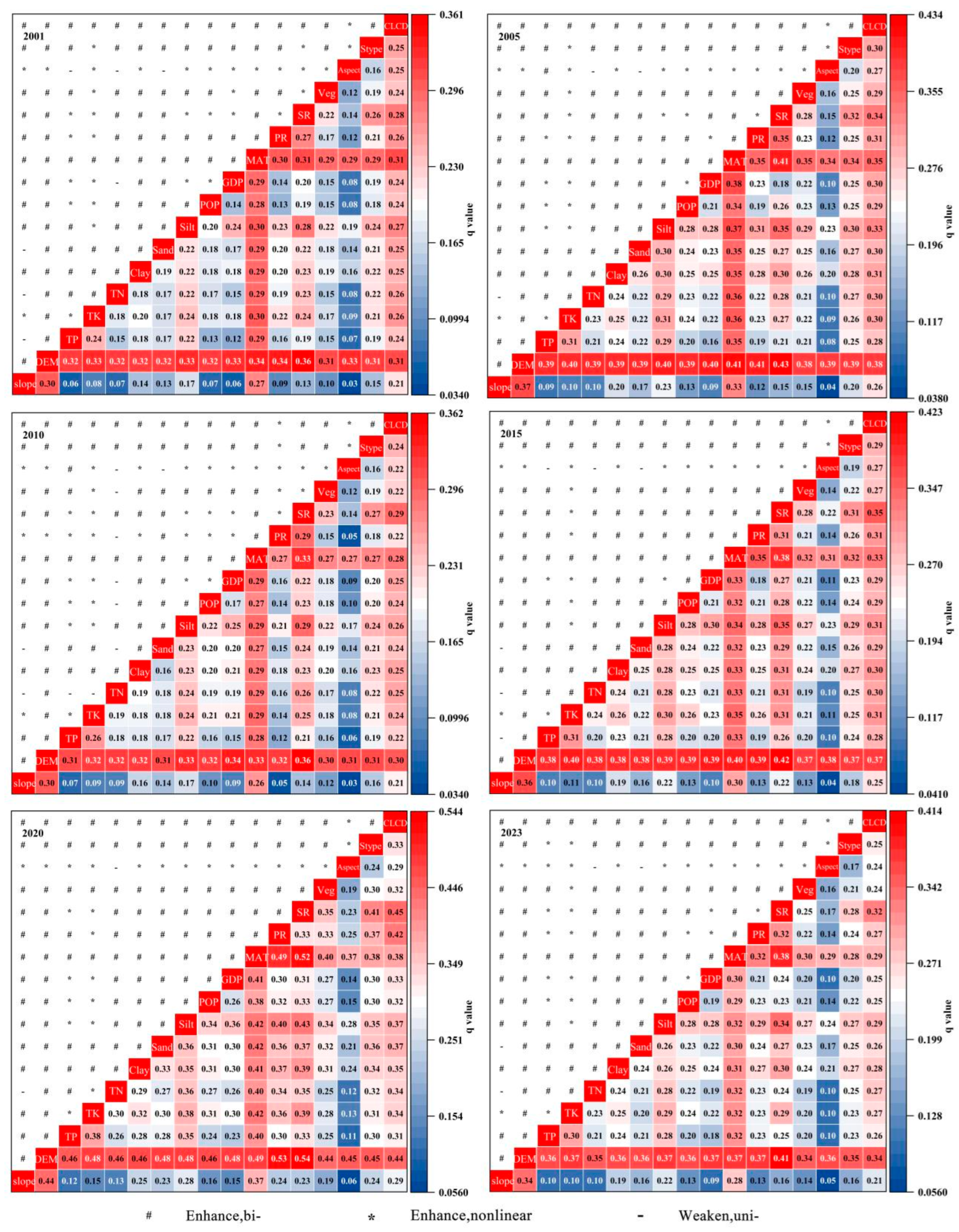The impacts of different factors on vegetation NPP varied substantially (Figure 9). Based on the Geodetector results for 17 natural and socioeconomic variables in the GPNP, the explanatory power (q-values) ranked as follows: elevation (DEM, 0.344) > mean annual temperature (0.289) > land use type (0.223) > silt content (0.200) > clay content (0.175) > total nitrogen (TN, 0.173) > soil type (0.166) > sand content (0.164) > solar radiation (SR, 0.158) > vegetation type (0.125) > mean annual precipitation (PR, 0.112) > population density (POP, 0.105) > gross domestic product (GDP, 0.083) > total potassium (TK, 0.082) > total phosphorus (TP, 0.079) > slope (0.023) > aspect (0.015). The explanatory power of factor interactions was consistently higher than that of individual factors, with more than 90% of variable pairs exhibiting either bi-enhancement or nonlinear enhancement effects. Only a minority of interactions showed univariate weakening, mainly where slope, TN, TP, TK, or sand content were associated with reduced explanatory power. Interannual variations in q-values were observed, but overall, the interaction between elevation and climatic variables remained the strongest, particularly between elevation and solar radiation (Figure 10).