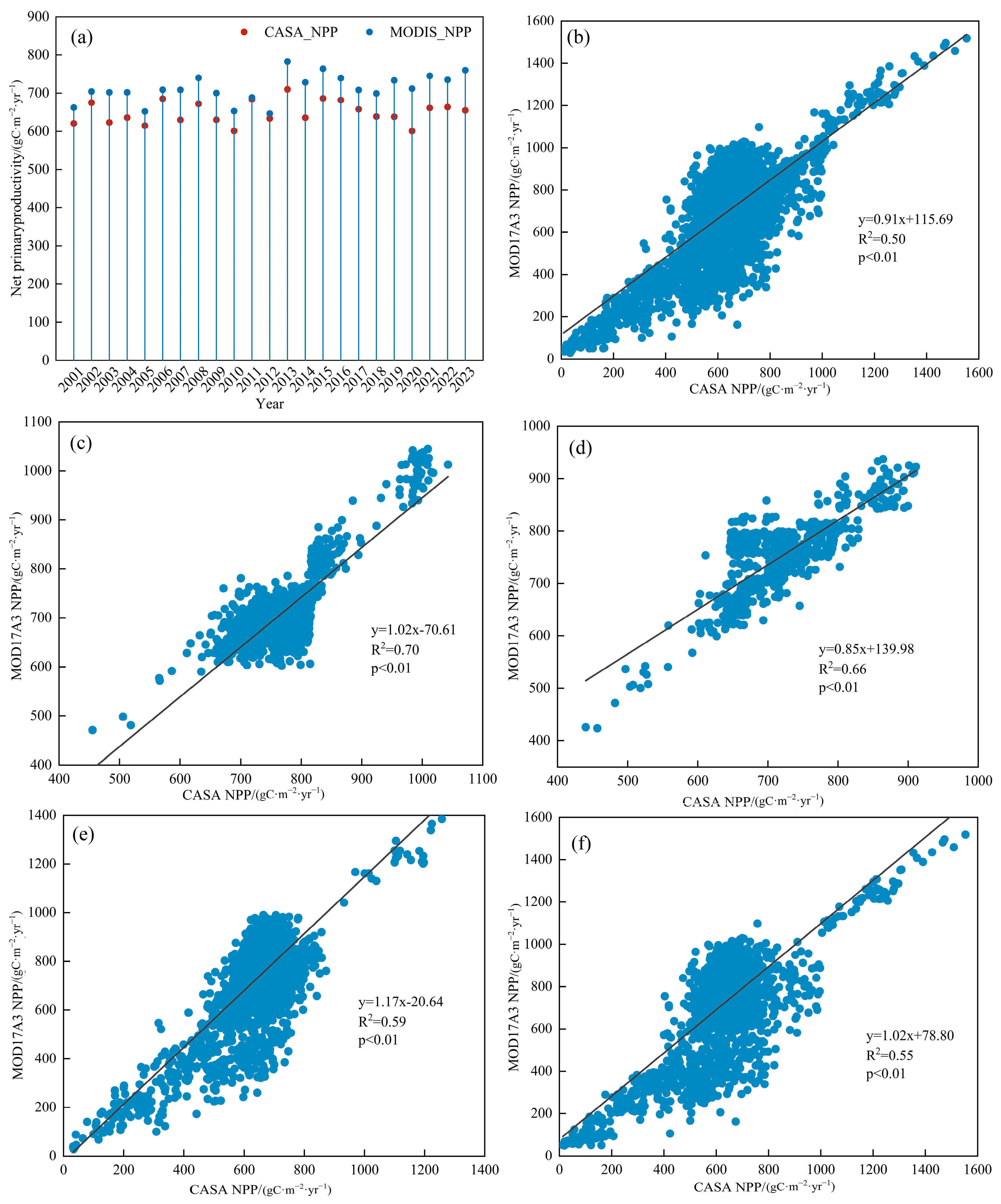 Figure 11. Comparison between NPP estimated by the CASA model and the MOD17A3 product. (a) Interannual variation of 2001–2023 annual mean NPP for the GPNP from CASA and MOD17A3; (b) Scatter comparison of multi-year mean NPP from CASA and MOD17A3 at the park scale; (c) Scatter comparison for the Qinling subregion; (d) Scatter comparison for the Baishuijiang subregion; (e) Scatter comparison for the Minshan subregion; (f) Scatter comparison for the Qionglai–Daxiaoxiangling subregion.