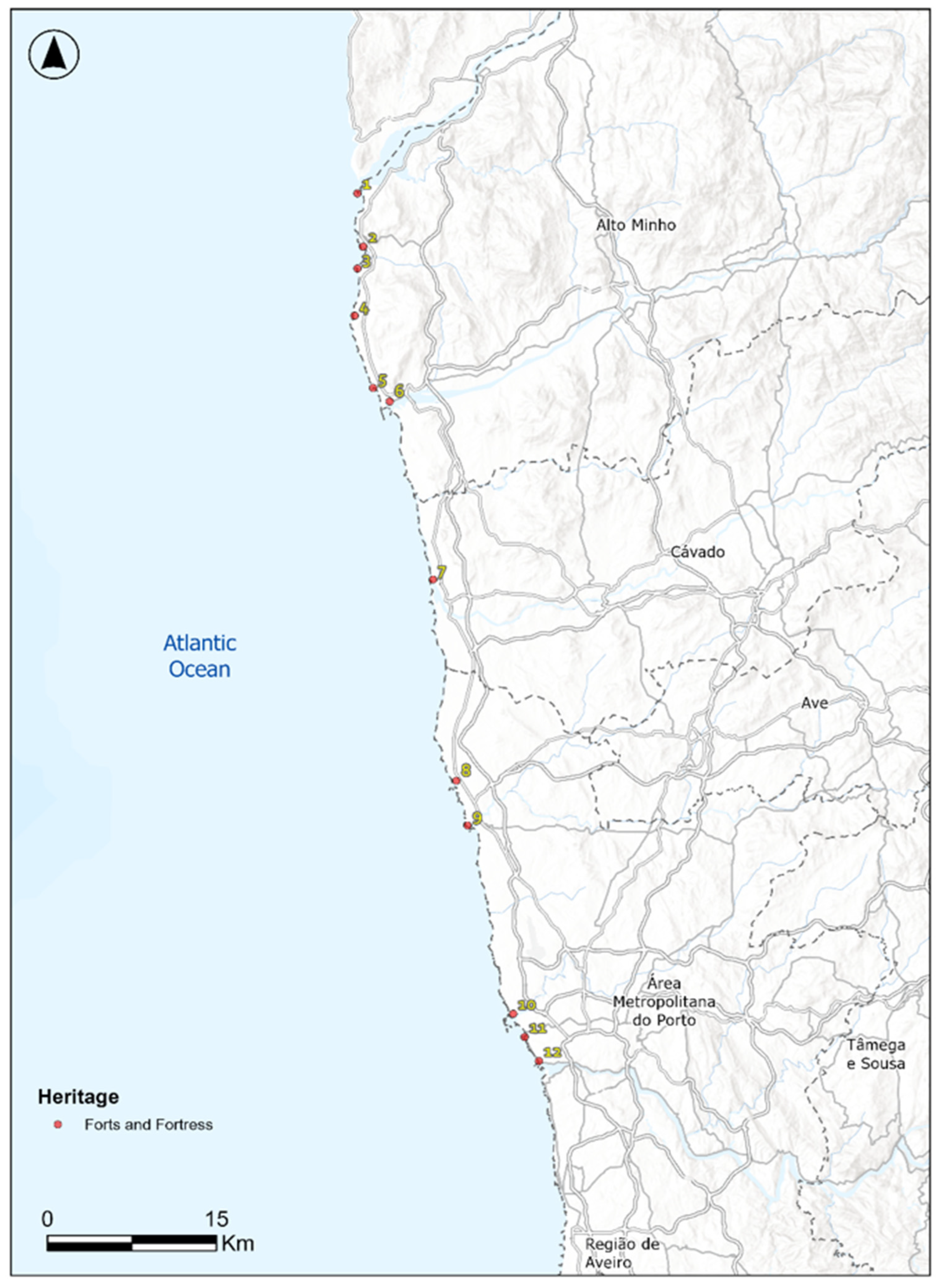 This study employed an initial qualitative research approach that integrated documentary analysis, a literature review, and systematic field observation. Historical and typological data on the coastal fortifications were consolidated from bibliographic sources and existing inventories, particularly those of the Directorate-General for Cultural Heritage, to establish a historical and contextual foundation for subsequent field analysis. In this study, we also used the data available in SIPA (the Sistema de Informação para o Património Arquitectónico) [14] as the primary national source of cultural-heritage information. Portugal also maintains official lists of sites classified as “Buildings of Public Interest” and “National Monuments”, which we incorporated. These registries provide descriptive, historical, and legal-status information, but they vary in completeness, offer inconsistent or missing geospatial attributes, and focus mainly on architectural heritage. As a result, many landscape-scale or locally recognized heritage elements relevant to our analysis are not included. To address these gaps, we added standardized spatial data, harmonized metadata, landscape-level attributes, and additional heritage elements obtained from regional and local inventories. This enriched dataset serves as the basis for the analysis presented in the paper.