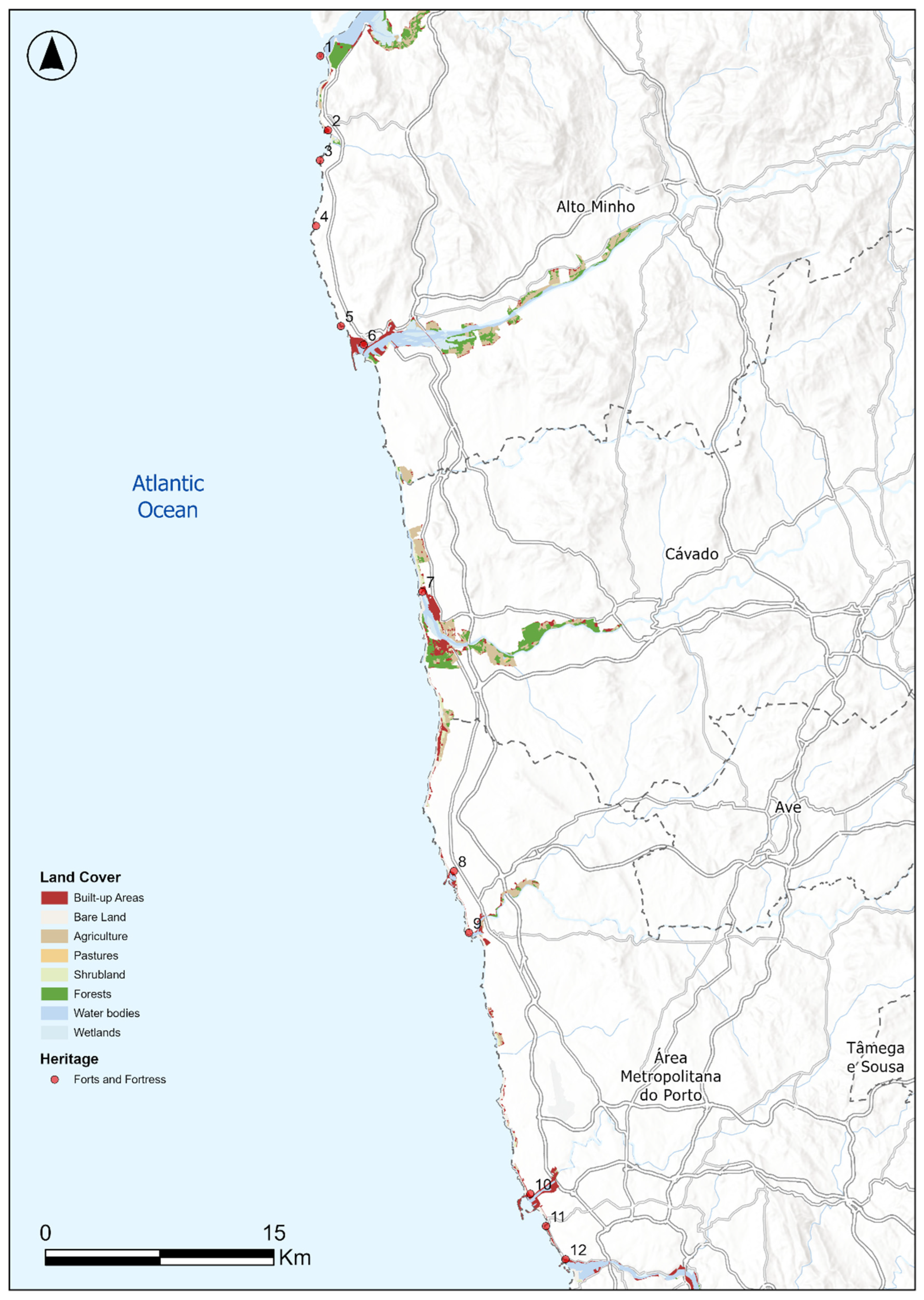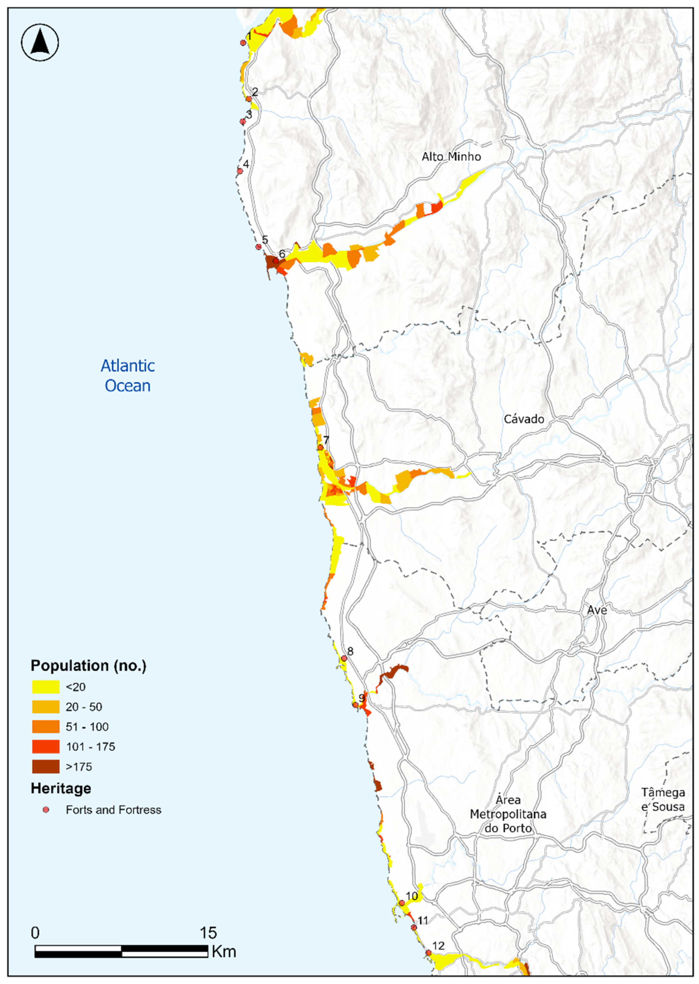 In the context of preservation and adaptation, it is imperative to undertake a comprehensive analysis of the subject’s integration over the past decades, with particular emphasis on population growth and land use (Figure 2 and Figure 3). The analysis of coastal population and land-cover maps reveals a markedly heterogeneous, yet clearly anthropized, narrow strip along the northwestern Portuguese coast. The population is concentrated in areas surrounding the primary coastal towns and estuaries. The highest population density is observed in areas with continuous built-up areas, transportation infrastructure, and adjacent agricultural or pastureland. Conversely, less populated sectors are distinguished by a more fragmented mosaic of forests, shrubland, and, in some cases, wetlands and water bodies, suggesting the presence of areas where natural or semi-natural cover still predominates. Forts and fortresses are distributed along nearly the entire coastline. However, many of these cultural heritage assets are in or immediately adjacent to the most urbanized and densely populated segments. This observation highlights the cumulative exposure of these heritage assets to both intensive human pressure and coastal hazards.