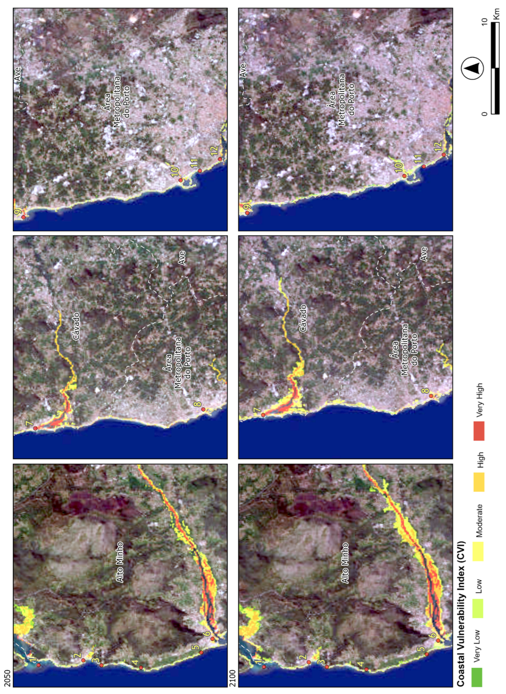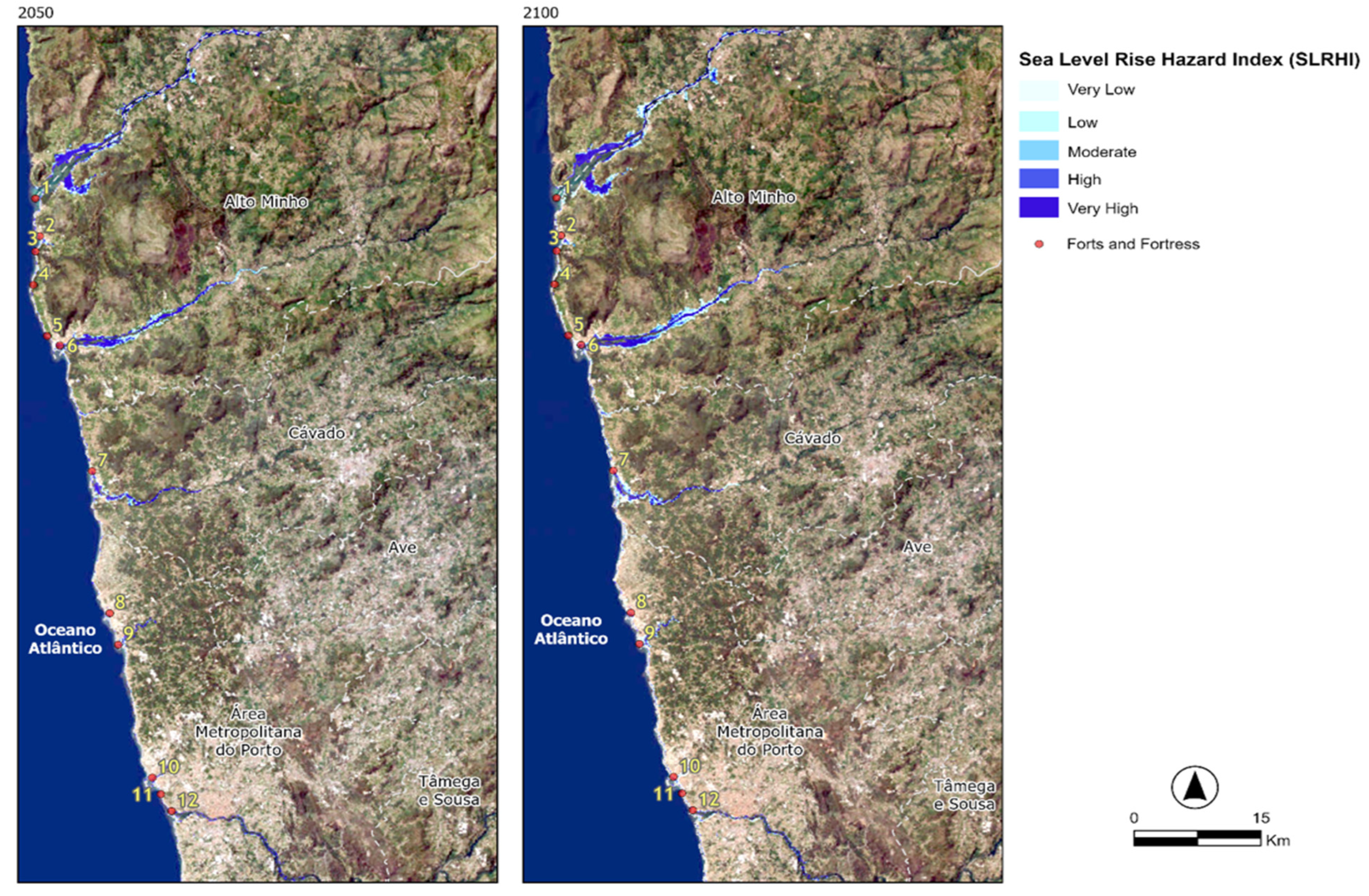 The CVI is a composite index with values ranging from 1 (Very Low) to 5 (Extreme). For each fortification, six criteria were considered: (1) flooded area under the extreme sea-level rise scenario; (2) distance to the coastline; (3) coastal typology (rocky, sandy/dune or estuarine shore); (4) geology; (5) land use; and (6) hydrographic network (proximity to and density of drainage channels).