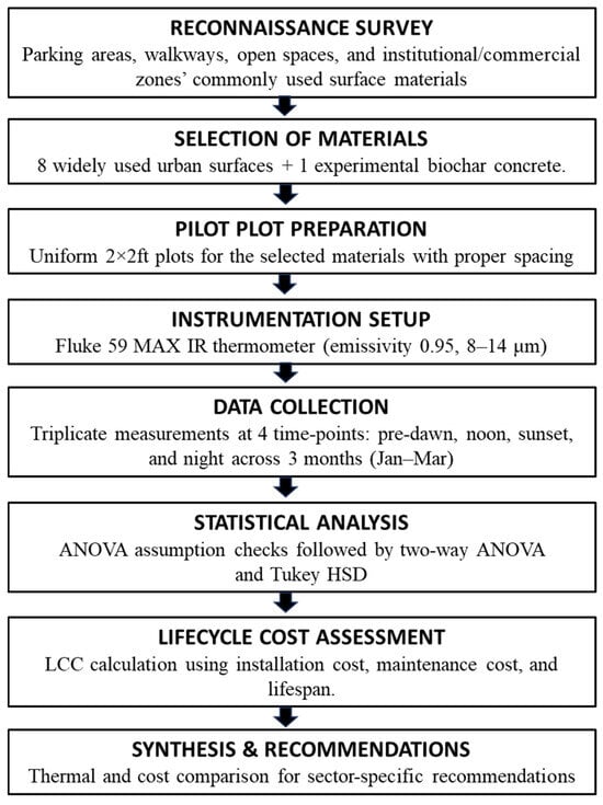 In addition to these widely used materials, an experimental category was incorporated in the form of biochar-amended concrete (10% substitution), developed as a pilot intervention to evaluate the potential of sustainable construction alternatives in reducing surface heating. Together, these nine categories provided a comprehensive cross-section of surfaces typically present in tropical urban environments, enabling comparison of both conventional practices and innovative materials. The barren soil was considered the control. The rationale for the selection of these eight dominant categories is grounded in their prevalence, climatic relevance, and functional roles within Chennai’s urban landscape. These surfaces represent the most used materials across mobility corridors (concrete, interlocking and parking tiles), reflective and heat-mitigating treatments (white paint, cooling tiles), and vegetated or semi-natural covers (natural grass, synthetic turf), along with exposed soil frequently found in vacant plots and unpaved open areas. Their widespread use, combined with their contrasting thermal properties, makes them appropriate benchmark materials for assessing surface SUHI behaviour under tropical climatic conditions. The overall research workflow, including material selection and analytical steps, is depicted in Figure 1.