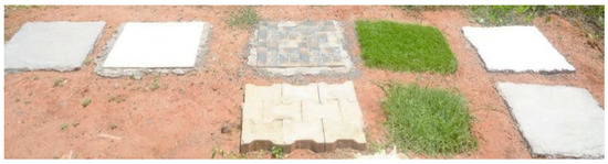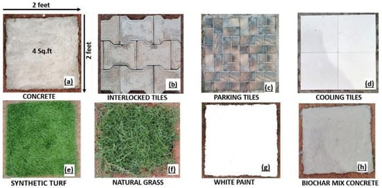 Each material was installed in plots of uniform size (2 × 2 ft; 4 sq. ft area), with adequate spacing maintained between plots to avoid mutual thermal interaction or lateral heat transfer (Figure 2). The barren soil plot served as a reference control to benchmark material-induced variations. Construction of the experimental units followed standard installation procedures, with surfaces such as tiles and grass laid over compacted soil bases, while concrete and biochar-mixed concrete were cast in situ. The biochar concrete was prepared by replacing 10% of the cement content with coconut shell-derived biochar, representing a sustainable material innovation.