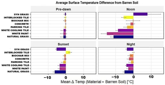 Surface temperature contrasts between different materials and barren soil showed clear diurnal variability (Figure 4).
