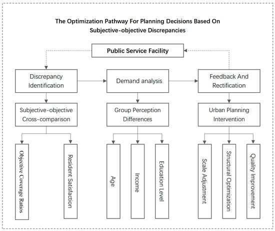 Finally, based on the analysis of perception discrepancies and their influencing factors, we establish a demand-responsive planning mechanism, as shown in Figure 1. This mechanism follows a three-stage optimization pathway: “Discrepancy Identification → Demands Analysis → Feedback and Rectification.” By systematically fusing subjective data with objective indicators, this framework enables a significant leap in the precision of resource allocation. It achieves this by integrating decision-making logic and datasets, expanding the range of participating stakeholders, and enhancing the responsiveness of the planning process, thereby ensuring a more accurate alignment between the supply of public resources and the actual demands of the community, as shown in Table 2.