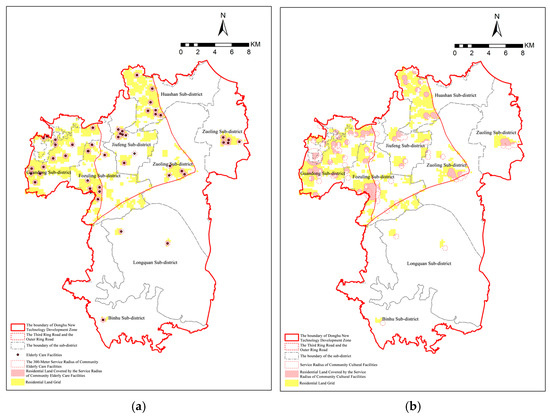 Using official point-of-interest (POI) data provided by relevant municipal departments, we calculated the objective supply for each facility category. This was measured as the service coverage within a 10–15 min walking radius (800 m) for the residential population. The resulting objective supply data are presented in Table 5. and the spatial distribution of these facilities is illustrated in Figure 2.