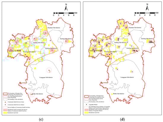 Coverage of various living facilities. (a) Elderly Care Facilities (b) Cultural Facilities (c) Health Services (d) Food Markets & Retail.