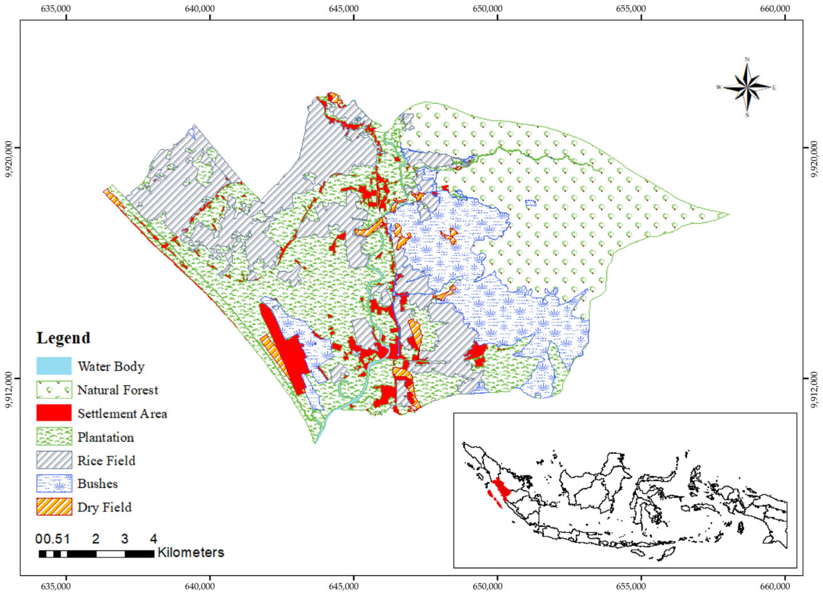 | Land Use Map—www.tanahair.indonesia.go.id | National mapping scale (1:40,000) | Static dataset: accessed on 8 January 2025 | Utilized to classify land use types within Batang Anai Subdistrict and to evaluate land use-specific drought exposure |