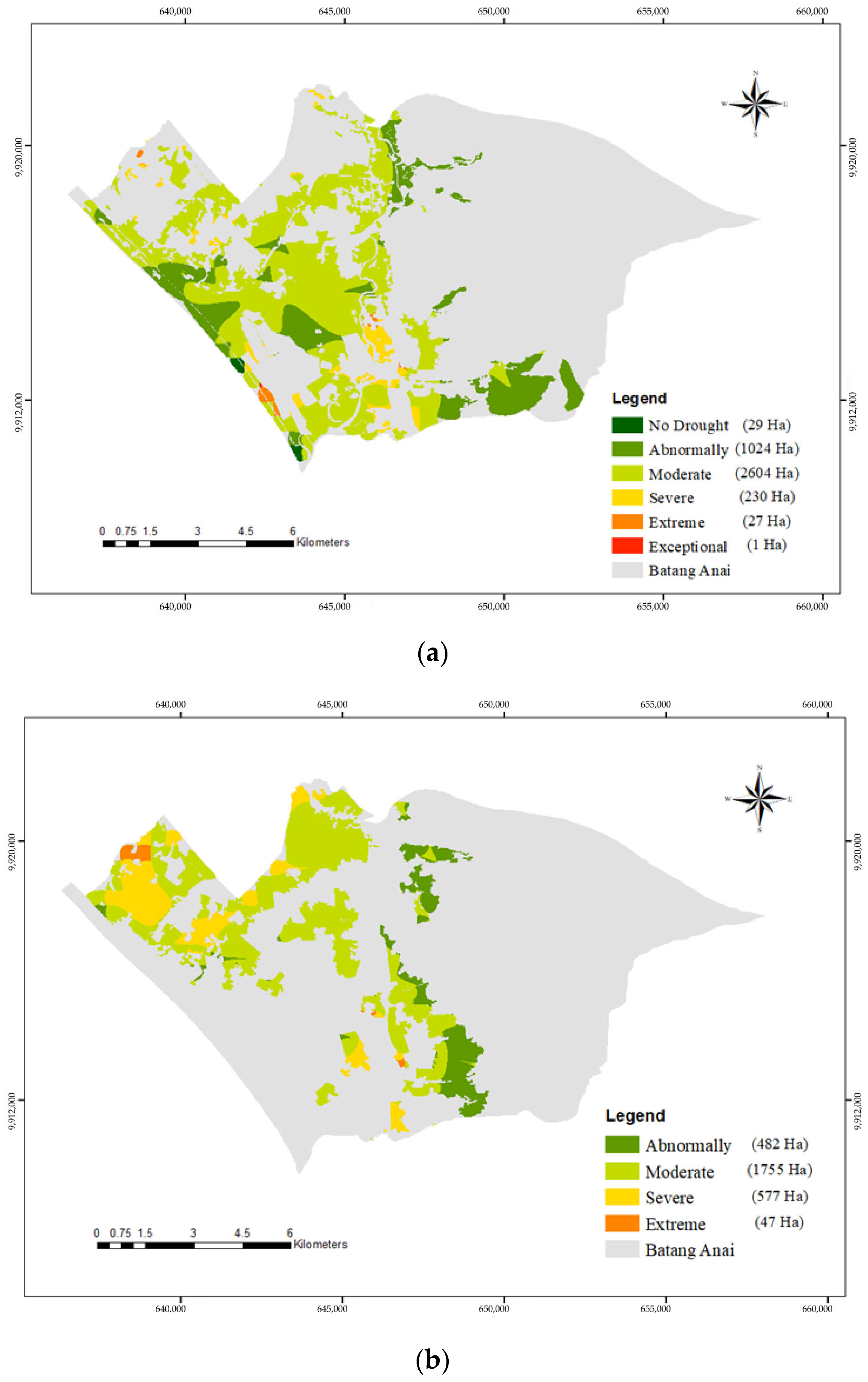 | Year | No Drought (ha) | Abnormally Low (ha) | Moderate (ha) | Severe (ha) | Extreme (ha) | Exceptional/Very Extreme (ha) |