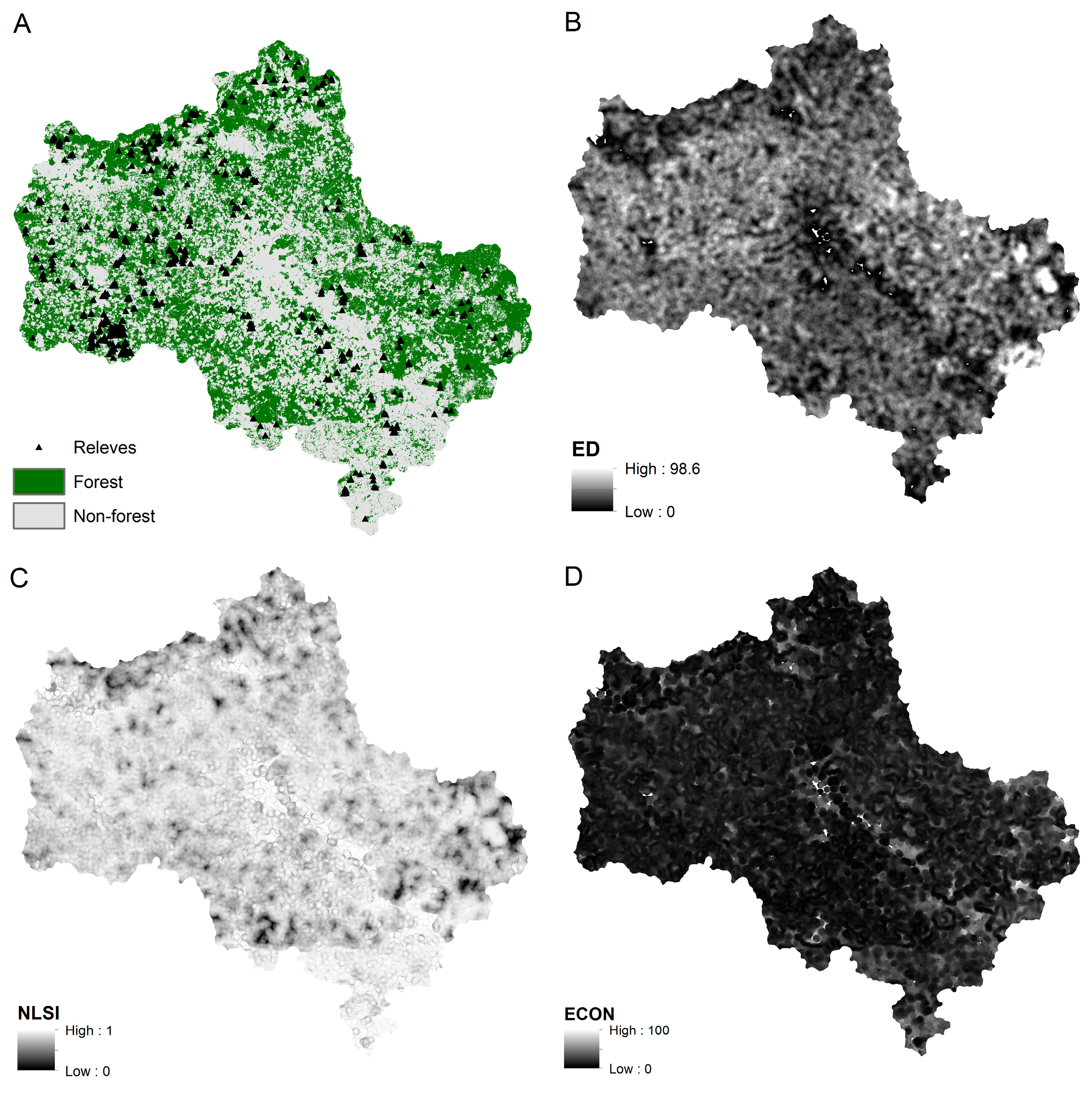 - Jaeger, J.A. Landscape Division, Splitting Index, and Effective Mesh Size: New Measures of Landscape Fragmentation. Landsc. Ecol. 2000, 15, 115–130. [Google Scholar] [CrossRef]