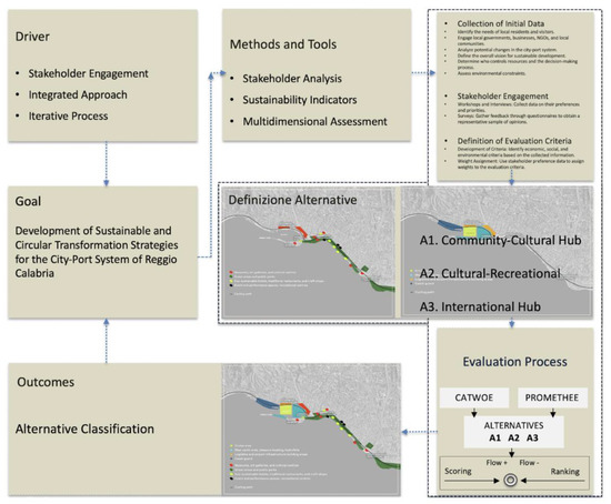 The proposed methodology addresses the challenges arising from the complexity of the scenarios and variables at play, facilitating a comparative analysis that allows for balancing the divergent priorities of stakeholders. This integrated approach, combining CATWOE and PROMETHEE, provides a robust framework for exploring opportunities and challenges, enabling the management of conflicts between differing interests through a negotiation process aimed at ensuring balanced solutions between environmental sustainability, social inclusion, and economic viability. The integration of PROMETHEE and CATWOE enables navigation through the challenges typical of complex decision-making processes, promoting the sharing of divergences and the validation of solutions. The iterative nature of the decision-making process allows for continuous feedback from stakeholders, ensuring that their evolving preferences are reflected in the final decision. Thanks to this cyclical and interactive approach, innovative strategies for the city–port system have been developed, taking into account the diverse needs and perspectives of stakeholders. The final alternative selected aims to promote circular, adaptable, and resilient development capable of responding to the ongoing economic, environmental, and social transformations of the context.
