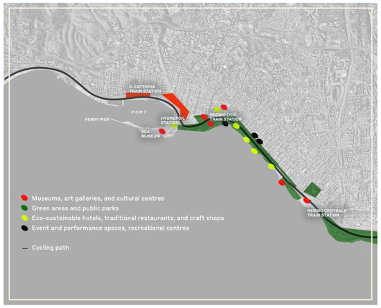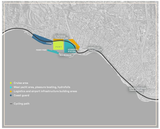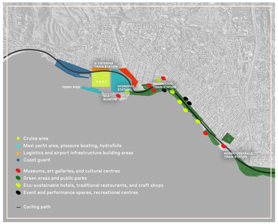 Among the ongoing projects for the redevelopment of the city–port system, interventions focused on the regeneration of the waterfront and improving the connection between the port and the city center stand out. The plan includes the creation of new publicly accessible spaces, such as green areas and pedestrian paths, aimed at enhancing accessibility and quality of life for both residents and visitors, as well as improving ecological, environmental, and climate-related aspects. Another key element is the implementation of sustainable infrastructure, such as renewable energy systems and technologies for water resource management, in line with the objectives of the blue economy [39]. The project also includes the transformation of disused areas into multifunctional hubs dedicated to cultural, social, and entrepreneurial activities, aiming to stimulate an economic rebirth based on the diversification of activities and innovation.