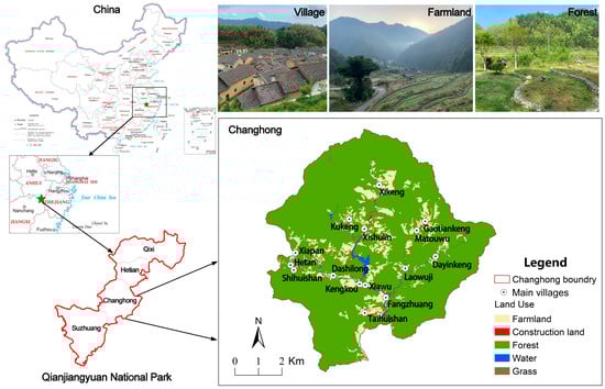 The Qianjiangyuan National Park (QNP) was established in 2016 and is one of the pilot areas in China, located in Quzhou City, Zhejiang Province, at the junction of Zhejiang, Anhui, and Jiangxi Provinces, with a total area of 252 km2. The QNP is located in the southeastern coastal area of China. As shown in Figure 1, the QNP involves four townships in Kaihua County, including 19 administrative villages. The areas covered by the QNP include national nature reserve and national forest park with significant landscape and ecological values. In addition, the QNP features a globally rare and typical middle-subtropical zonal vegetation—specifically, a low-altitude native evergreen broad-leaved forest [47]. Moreover, The QNP has apparent geological and geomorphological features, including gravity slope landforms, granite mountains, various types of faults, river terraces, canyons, and other geological and geomorphological landscapes of scientific demonstration value [48]. The QNP has a rich cultural heritage and has historically been characterized by mountain farming and forestry as the primary source of livelihood.